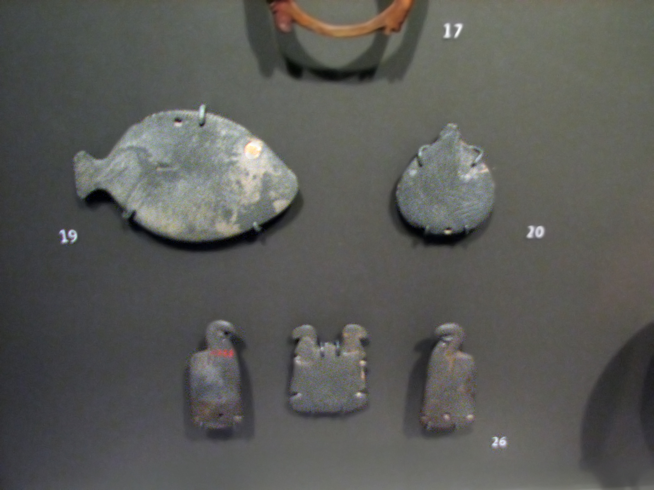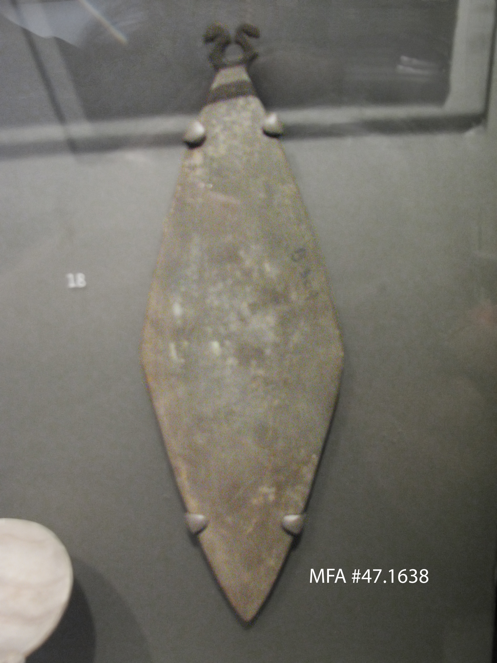 "Hard stone palettes were used to grind malachite (a green copper ore) for eye paint, and were buried as offerings in the graves of both men and women from the end of the Neolithic period. They were usually placed near the head of the deceased, or perhaps suspended on a cord or leather thong around the neck. The earliest examples are flat and geometric, usually rectangular, but in the earliest phase of the Predynastic era (known as Naqada I), new shapes emerged, including representations of fish, birds, and turtles." (From museum website)