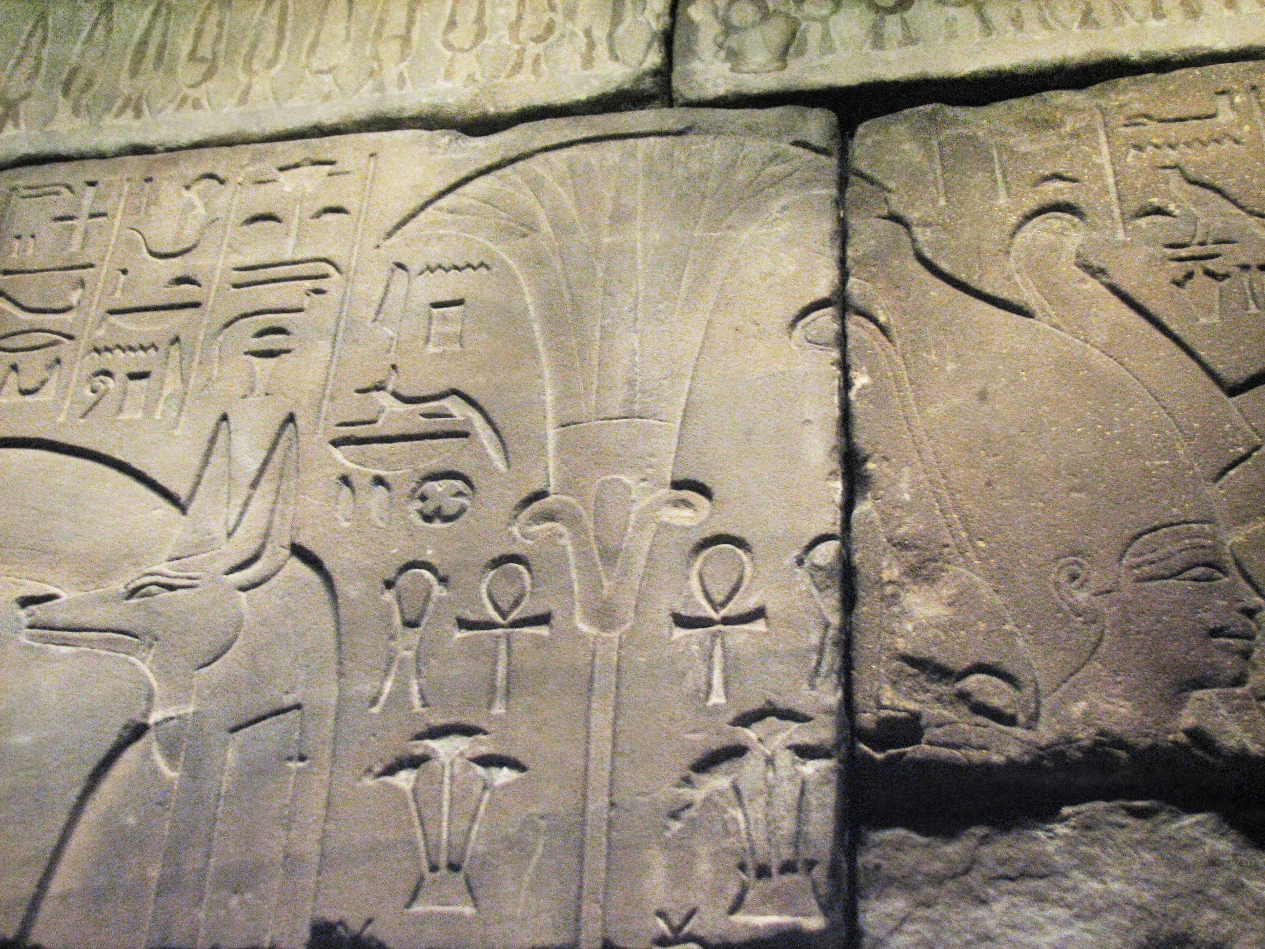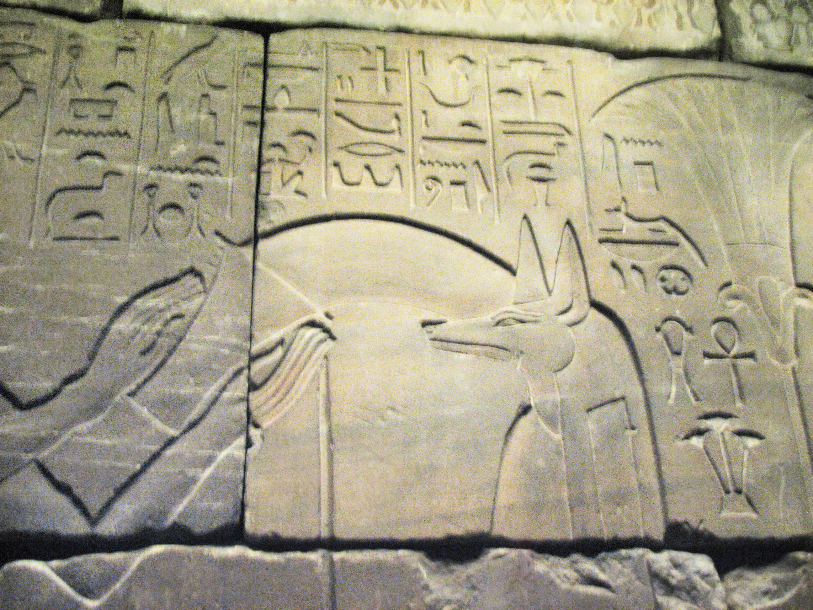 The papyrus column at the center of the scene, showing the glyphs for Anubis, (Anpu), and Osiris' face, which still bears evidence of red paint.