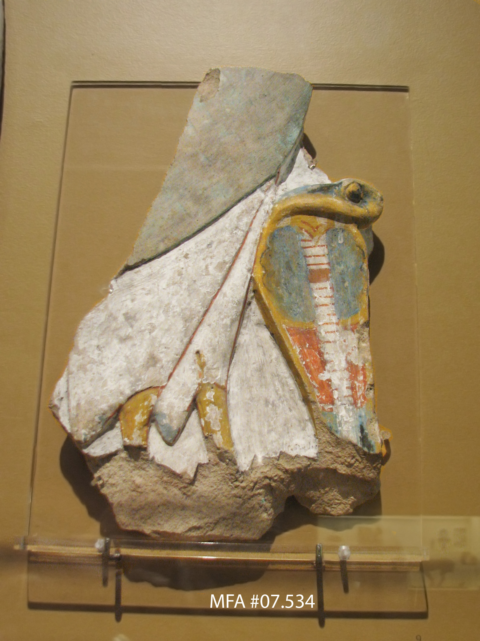 "This fragment comes from a panel bearing the queen's name on a column in the upper court of her mortuary temple. The falcon and the uraeus serpent are protective deities for royalty" (From info card)