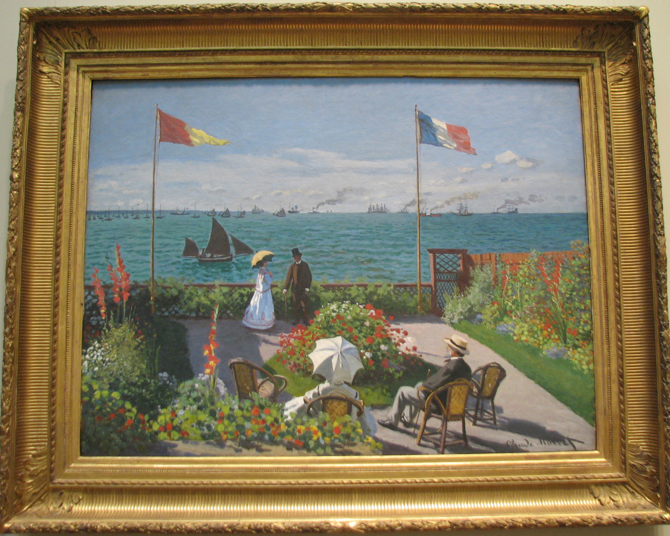 "Monet painted this canvas in the summer of 1867 in a Sainte-Adresse garden with a view of Honfleur at the horizon. The models were probably Monet's father, Adolphe, in the foreground; Monet's cousin Jeanne Marguérite Lecadre at the garden fence; Dr. Adolphe Lecadre, her father; and perhaps Lecadre's other daughter, Sophie, the woman seated in the foreground with her back to the viewer. Although this scene projects affluent domesticity, it is by no means a family portrait. Monet's relations with his father were tense that summer, owing to family disapproval of the young artist's liaison with his companion, Camille Doncieux.