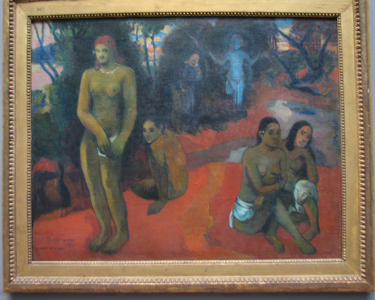 "One figure that recurs from the larger work is the blue goddess. She is the deity Hina, prominent in an ancient Polynesian creation myth, whom Gauguin represented in sculpture and painting repeatedly. Gauguin's interpretation of her appearance is based upon a variety of sources from Hindu and South Asian art and culture. Gauguin described Hina as an emblem of the "hereafter," alluding to both the cycles of life represented in the work (by the infant and old woman) and his stated intention that the grouping of work would be his final artistic statement. Experiencing numerous maladies, financial problems, and depression, he intended to commit suicide when the work was finished (he died several years later at age 54 from a variety of diseases he had contracted). Despite these seemingly explicit biographical interpretations, this painting and related canvases, like much of Gauguin's work, retain a sense of mystery. "Known symbols would congeal the canvas into a melancholy reality," he wrote, "and the problem indicated would no longer be a poem.""