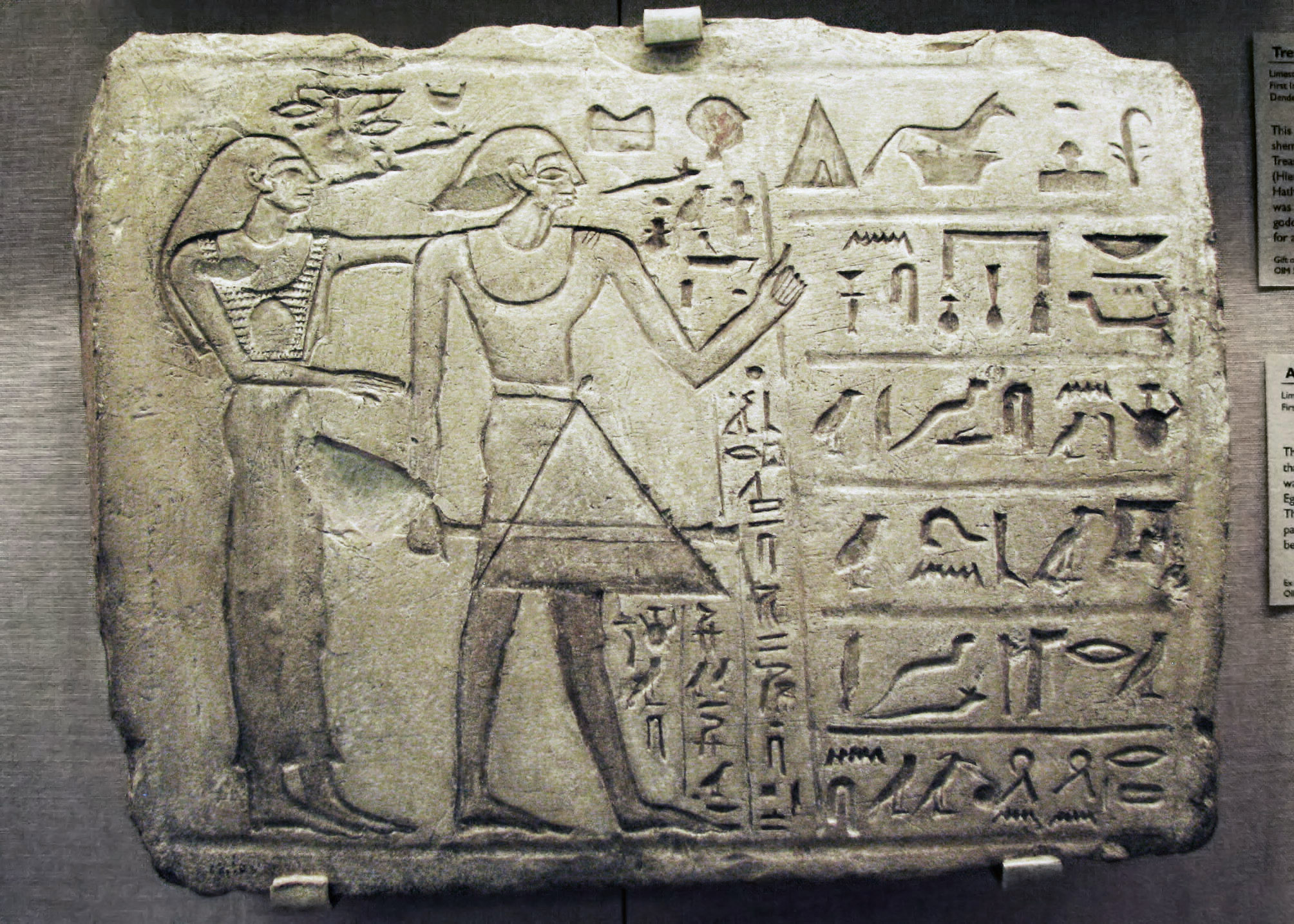 (From museum info card): "The hieroglyphic text on this fragment from a tomb records that the man, named Khemnsu, was an overseer of priests who was sent by a regional ruler to inspect a town in southern Egypt that had been destroyed in battles between rival rulers. The text relates that he refounded the city and regulated taxes paid to the rulers in Thebes. He is shown embraced by 'his beloved wife' Nofret." "The inscription on this statue of a man identified as Tcheneneti, records that he served as a confectioner (candy maker). Another monument of Tcheneneti from a later period in his career indicates that he was eventually promoted to the position of 'Overseer of Confectioners.'" |