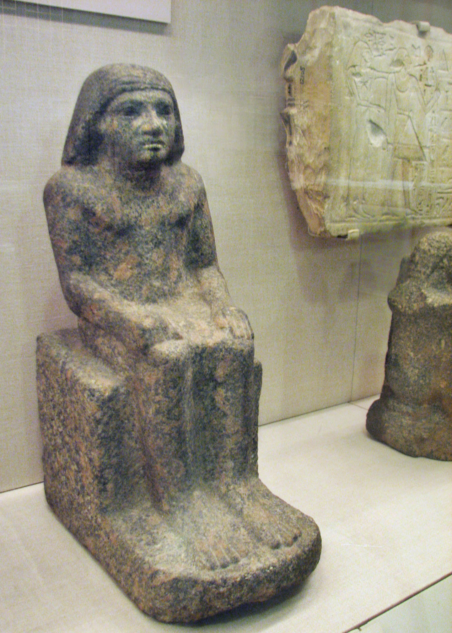 (From museum info card): "The inscription on this statue of a man identified as Tcheneneti, records that he served as a confectioner (candy maker). Another monument of Tcheneneti from a later period in his career indicates that he was eventually promoted to the position of 'Overseer of Confectioners.'"