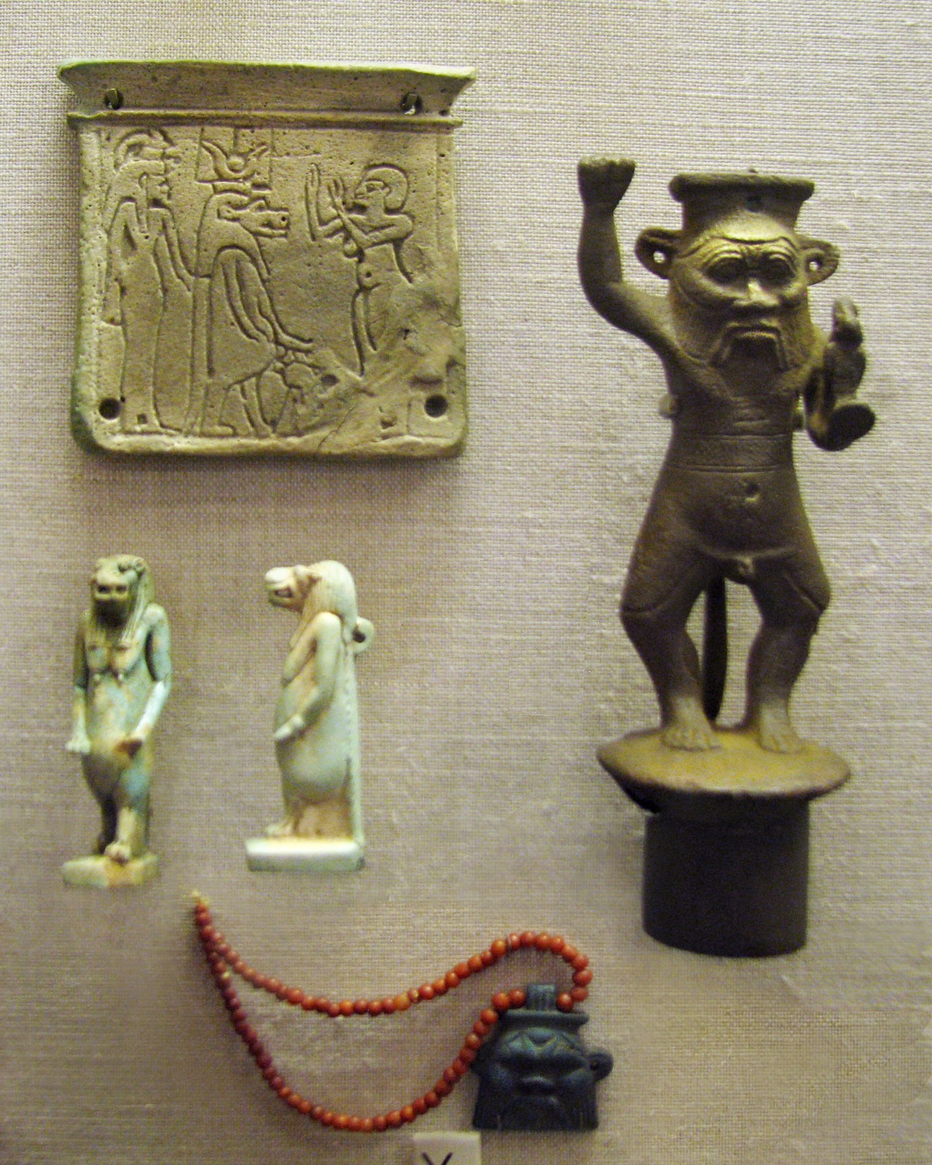 (From info card): "The protection of infants and mothers was entrusted to Taweret ('The Great One'), the hippopotamus goddess of pregnancy, and to a stocky dwarf with lion mane and tail who is known first as 'the fighter' and later as Bes. Images of Taweret and Bes were placed on bedroom walls and furniture and were worn as jewelry."