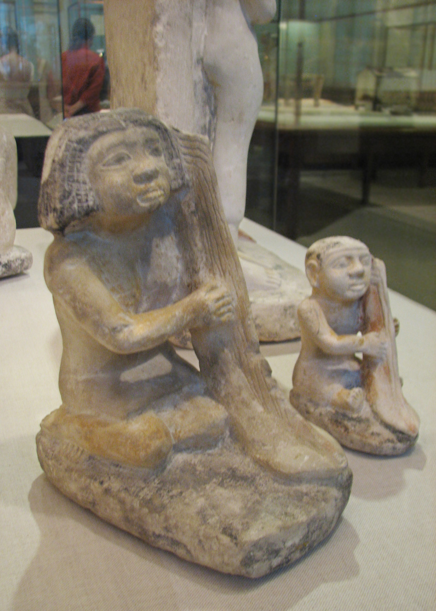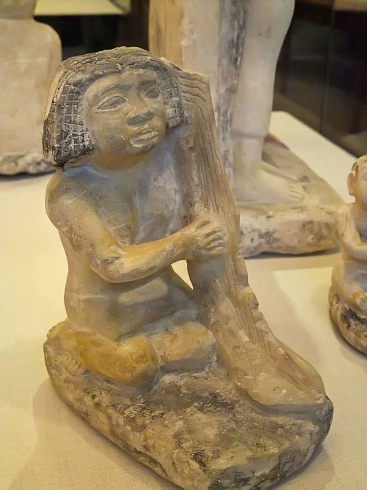 (From museum info card): These two statues are among a group of twenty-five "thought to have come from the tomb of a courtier named Nykauinpu at Giza. According to Egyptian beliefs, food and the pleasurable activities of daily life could be guaranteed in the afterlife by representing them in the tomb. As a result, statues such as these, which show individuals performing everyday tasks, were placed in tombs to perform necessary services for the deceased in the afterlife. Since statues were thought to be able to substitute for actual laborers..." (Photo of card cropped out further info.)