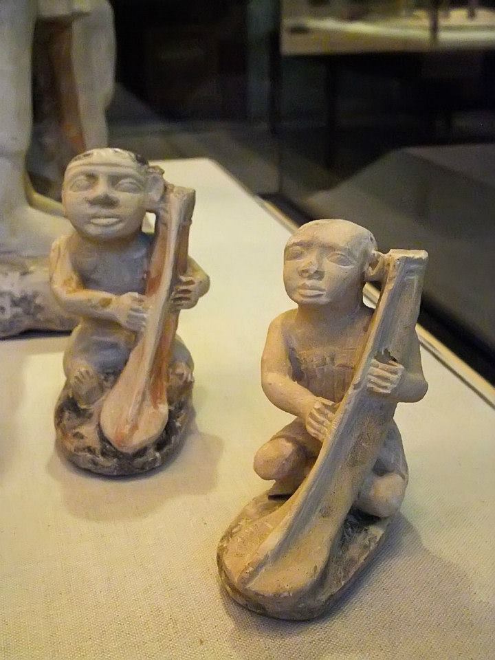 (From _Ancient Egypt: Treasures of the Oriental Institute_, by Emily Teeter, pages 21-24): "Among the most charming of the Ny-kau-inpu statuettes are three harpests, two of which are pictured here. They lean large shovel-shaped floor harps upon their left shoulders and pluck the strings with their right hands." |