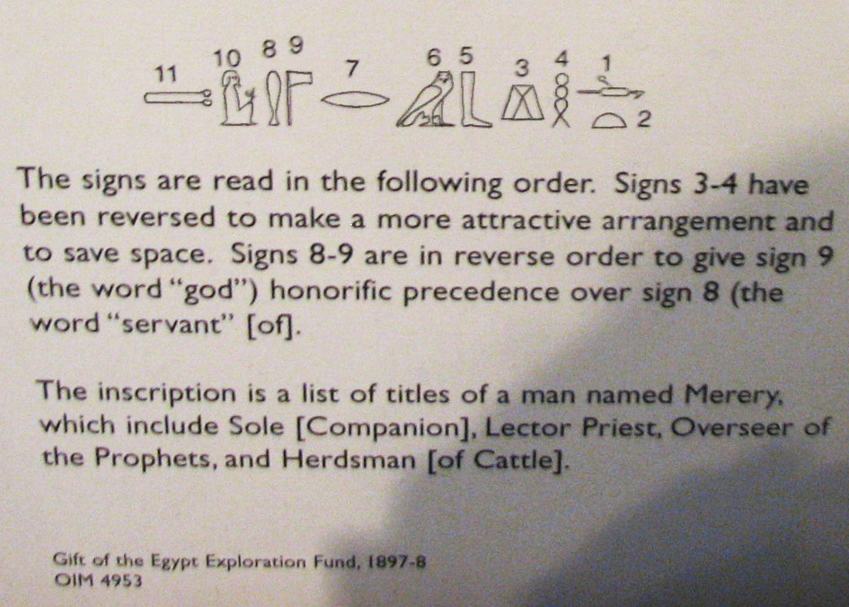 ![]() Oops! Bad Bird! (Photo credit for this photo © William Petty) "The inscription is a list of titles of a man named Merery, which include Sole [Companion], Lector Priest, Overseer of the Prophets, and Herdsman [of Cattle]." (Text in quotes is from museum info cards.) |