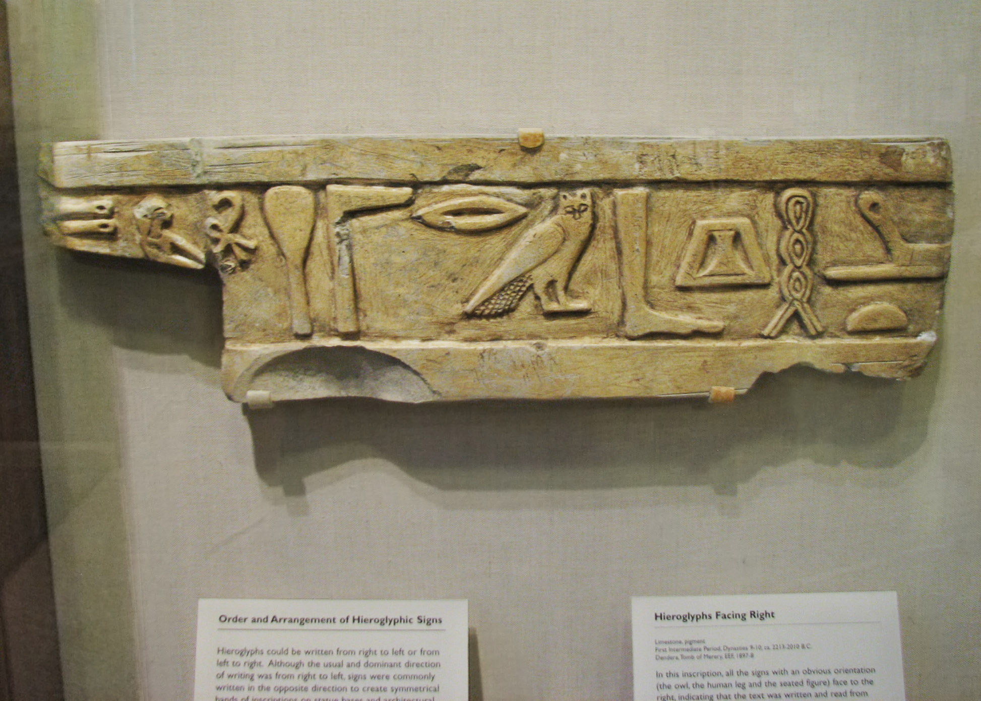 "In this inscription, all the signs with an obvious orientation (the owl, the human leg and the seated figure) face to the right, indicating that the text was written and read from right to left."