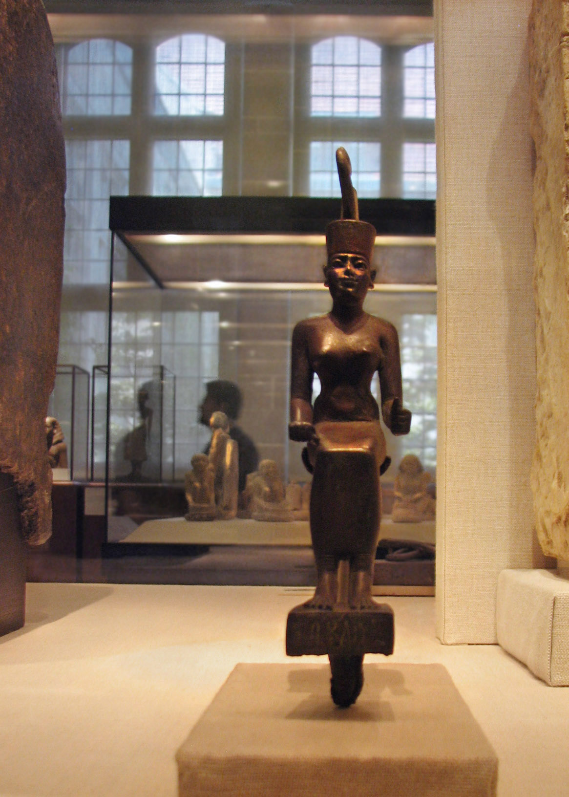 (From museum info card): "By the Late Period (7th century BCE), it was very common practice to present bronze statues to the temples, an act that was thought to show the piety of the donor. The popularity of this practice is demonstrated by a cache of statuettes discovered at Karnak in 1903 that contained over 14,000 bronze statues that had been presented to the temple over several centuries. This example portrays the goddess Neith, wearing the Red Crown and a long, tightly fitting dress." |