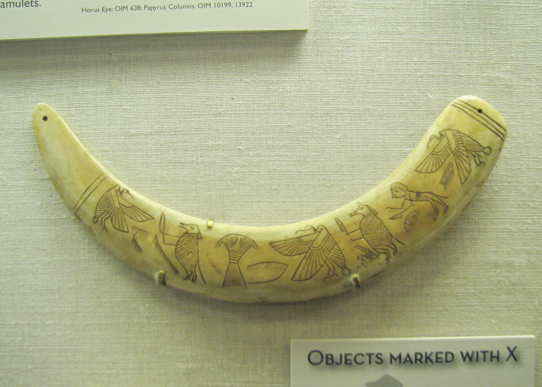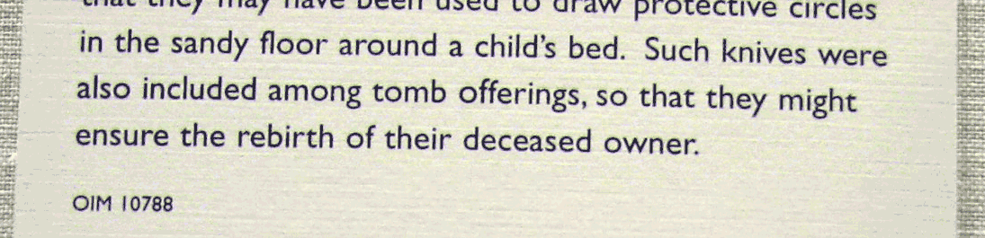 From _The Life of Meresamun_, edited by Emily Teeter and Emily H. Johnson): "In the Middle Kingdom and Second Intermediate Period, apotropaic knives were used in rituals of magical protection for women and children of all social classes. These knives, also referred to as 'wands,' were usually carved of hippopotamus ivory, invoking the protective powers of the hippotamus goddess Taweret, who was closely associated with childbirth. Examples also exist in wood, faience, and calcite. "The decoration of each knife is unique, but it generally includes deities associated with childbirth. The Oriental Institute example features the goddesses Nekhbet and Taweret and the god Aha wielding, and a protective amulet (the hieroglyphic sign [sa]). Indeed, Nekhbet, a vulture goddess, is evocative of the heiroglyph for the word 'mother [mut]. In addition, Aha (the 'fighter'), like Taweret, was a deity associate with childbirth. He became the leonine dwarf god Bes in later periods." |