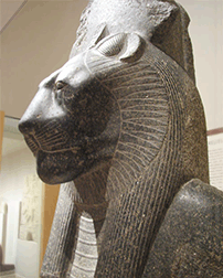 "It is thought that the black granite statues of Sekhmet, now scattered in museums throughout the world, once formed a huge monumental litany in stone. Jean Yoyotte has estimated that over seven hundred of them must have once stood in the now ruined funerary temple of Amenhotep III, on the west bank at Thebes, each dedicated to a particular day of the year. Alternately seated and standing, each lioness figure is crowned with a solar disk and fiery cobra snake, and holds either an Ankh-sign of life, or a papyrus sceptre, to symbolize the life-giving greenness of her propitiated state." |