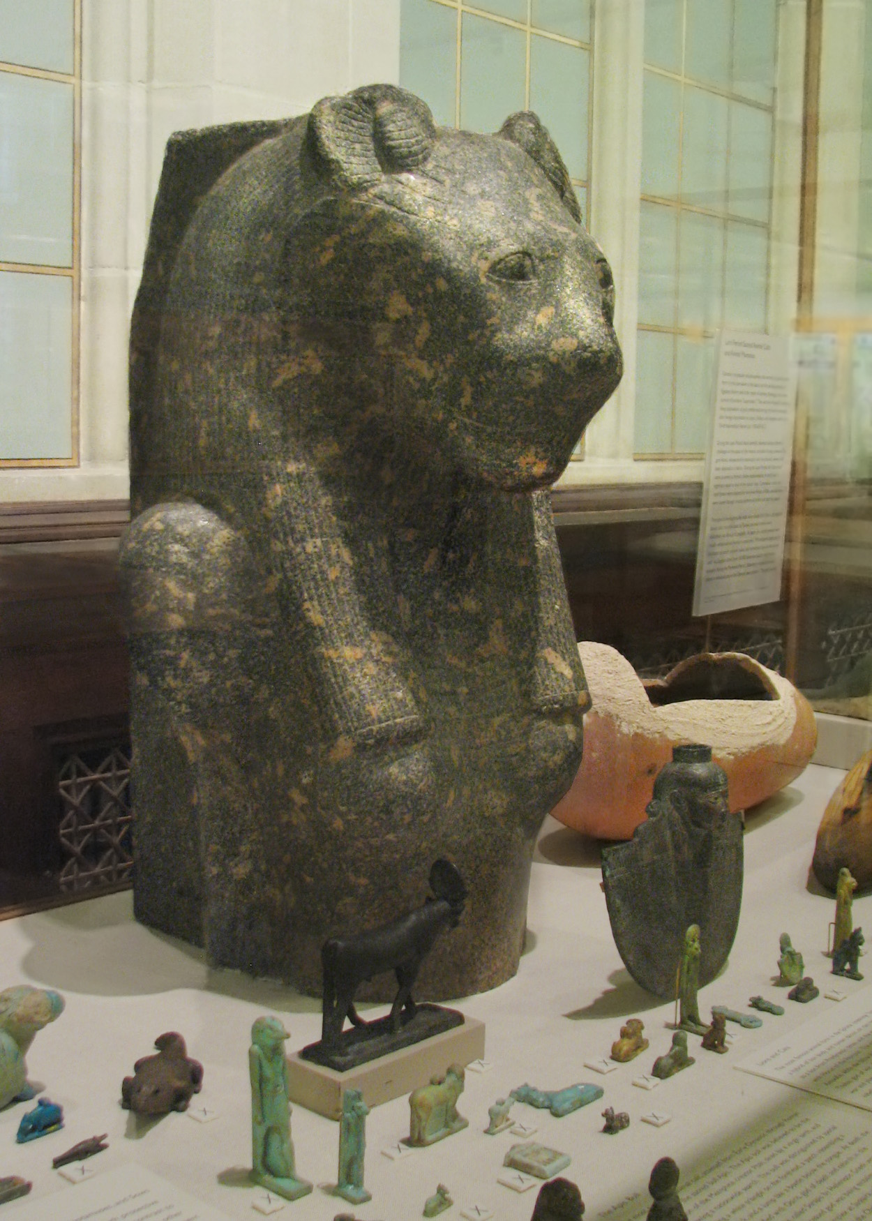 We know this, for there are many such statues, of which this one is a fragment of the whole. The Metropolitan Museum has several, each of them seated on a throne, and the Brooklyn museum has a partial Sekhmet: