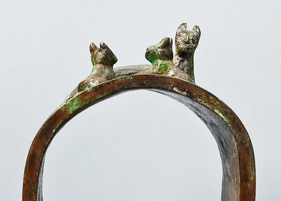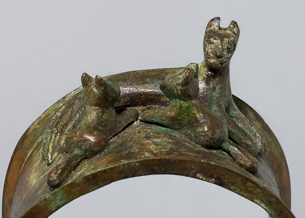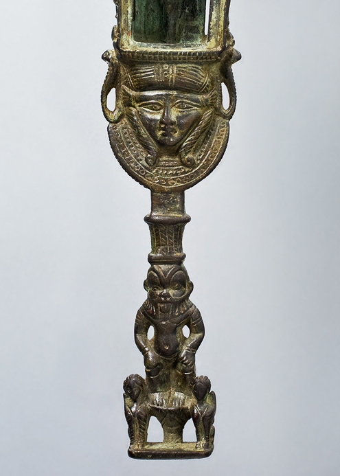 From "The Life of Meresamun: A Temple Singer in Ancient Egypt": "This example features a head of Hathor. Above the goddess is a tiny temple portal whose architraves are ornamented with recumbent lions. Crowned cobras rear up behind the lions." Among the details are "a cat nursing two kittens" "on top of the sistrum" and "the handle is in the form of the god Bes". |