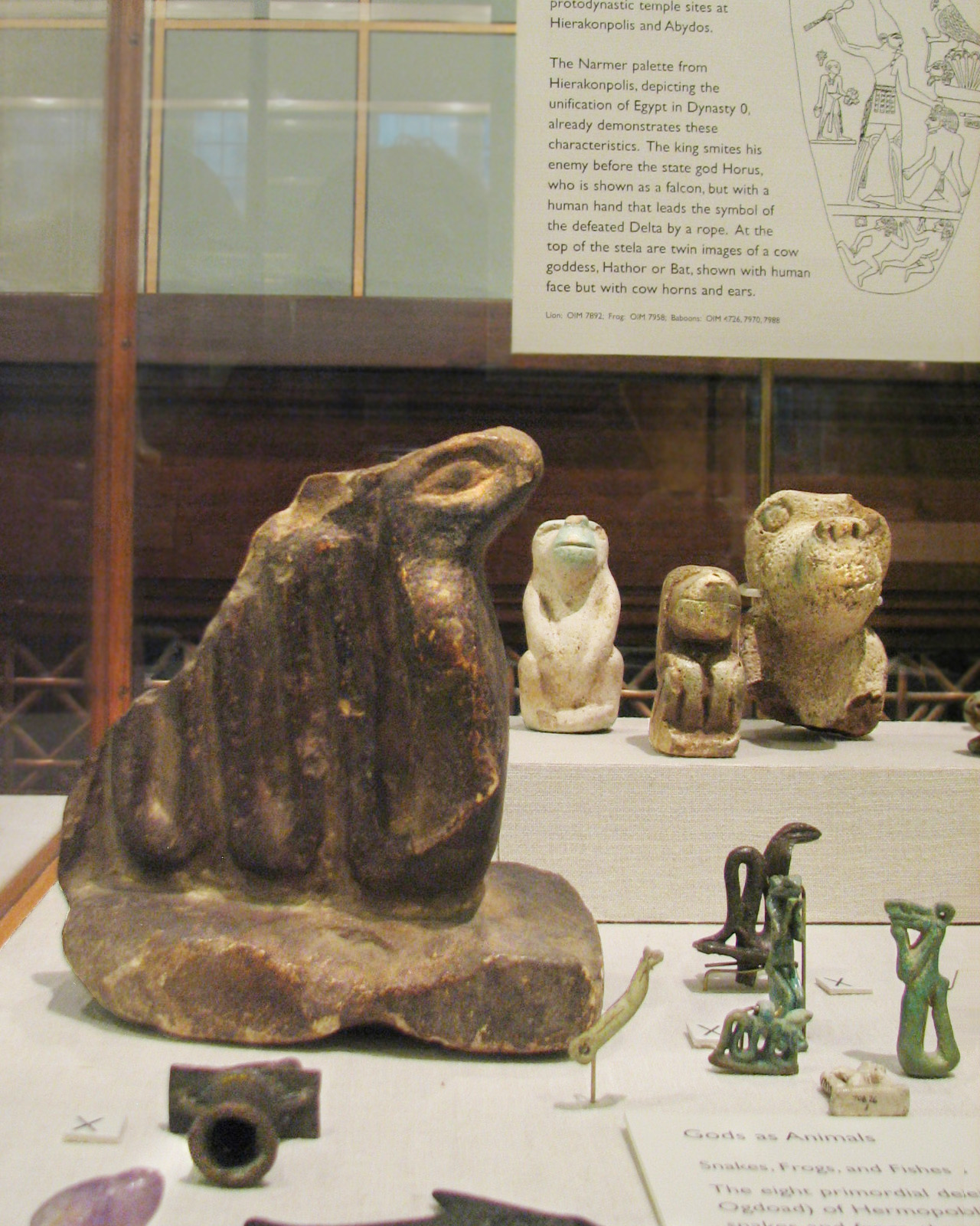 The relatively large statuette in the foreground may be: OIM 8301 - Statuette in the shape of serpent - Abydos, Grv M65 - Protodynastic - Flint - 90l mm The serpent amulets to the right could include: OIM 10113 - Amulet of serpent god Nehebkau (aka Nehebu-Kau), Green Glaze Faience, 2 Hands To Head, Seated, Left Leg Advanced, Suspension Ring Back Of Neck, Saite, 45x20x7 mm, OIM 17518 - Amulet of Nehebkau, Green Faience OIM 17517 - Amulet of Nehebkau - Green Faience I do have accession numbers for the three baboons, as seen in the card above them, from left to right: OIM 4726 - Faience figurine of sitting Baboon with Front Paws Over Knees Of Hind Paws, Traces Of Original Color, Hierakonpolis - Protodynastic, 82hx42w mm OIM 7970 - Faience statuette of Sitting Ape, Green Glazed Frit, General Form Rectangular, from Abydos Temple, Grv 69 - Protodynastic, 67x43x29 mm OIM 7988 - Fragment of ape statuette, Head & Shoulders, Faience, Glazed Frit - Abydos, Temple, Grv M69 - Protodynastic, 95h mm Photo ©Joan Ann Lansberry, 2010 Descriptive list which gave more info about baboon statues |