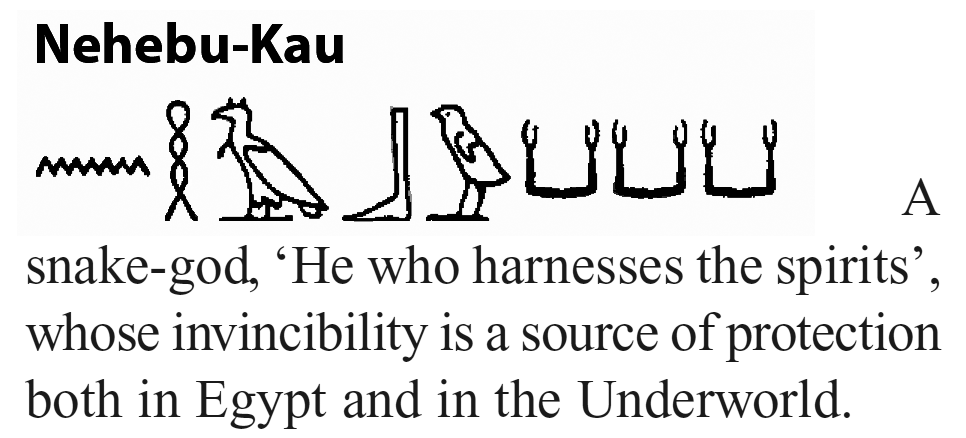 In later depictions, Nehebu-kau was shown as human with a snake head, but earlier, he is shown fully snake. Nehebu-kau is known for the ‘seven cobras’ he swallowed. Jeremy Naydler in _Temple of the Cosmos_ also gives "Provider of Life-Energies " as meaning of Nehebu-kau's name, (page 36). Frankfort and Cramer in _Kingship and the Gods_ say his name can be translated as "Bestower of Dignities" or as "Uniter of the Ka's". With all these attributes, it's easy to see why amulets of Nehebu-kau were so popular. |