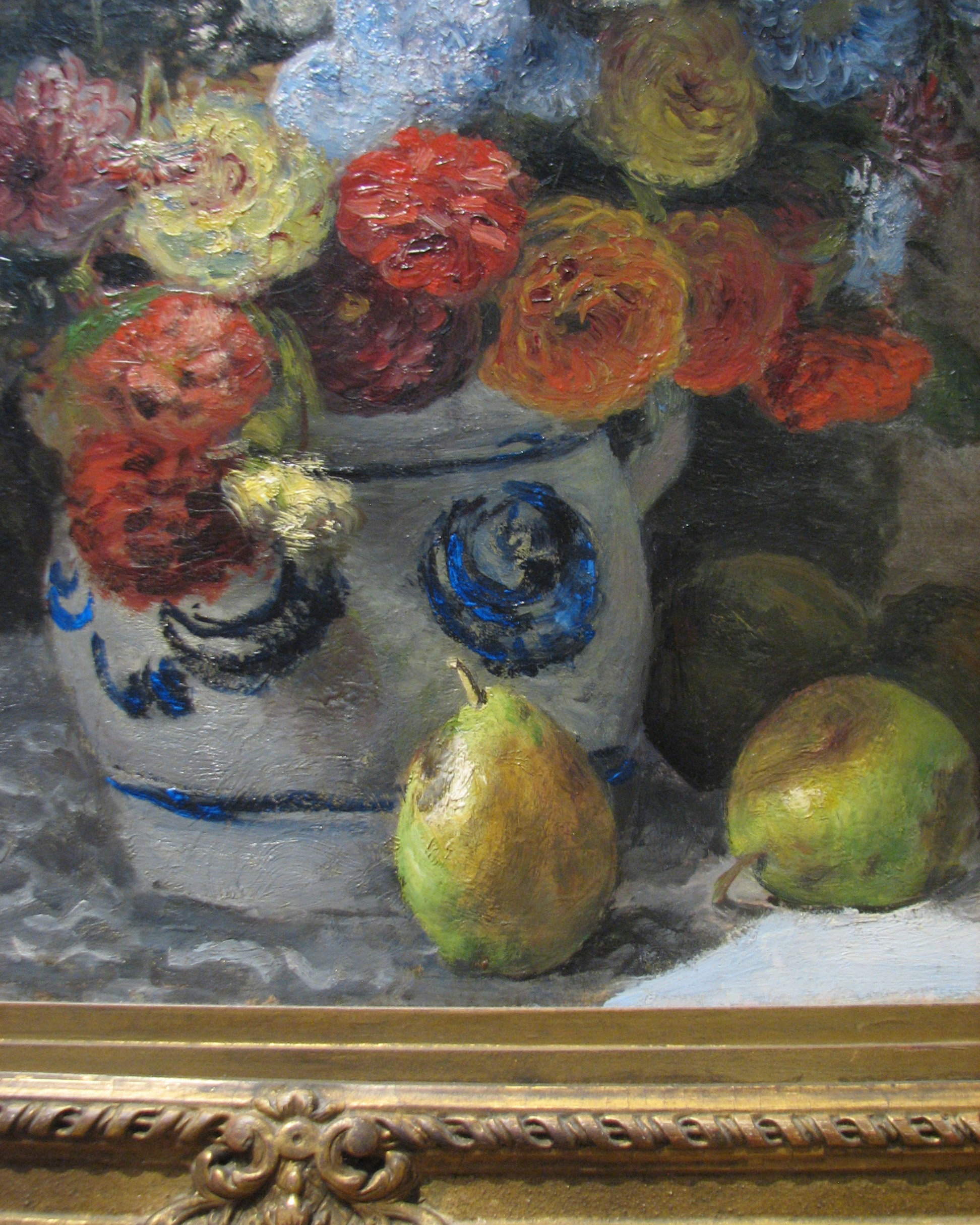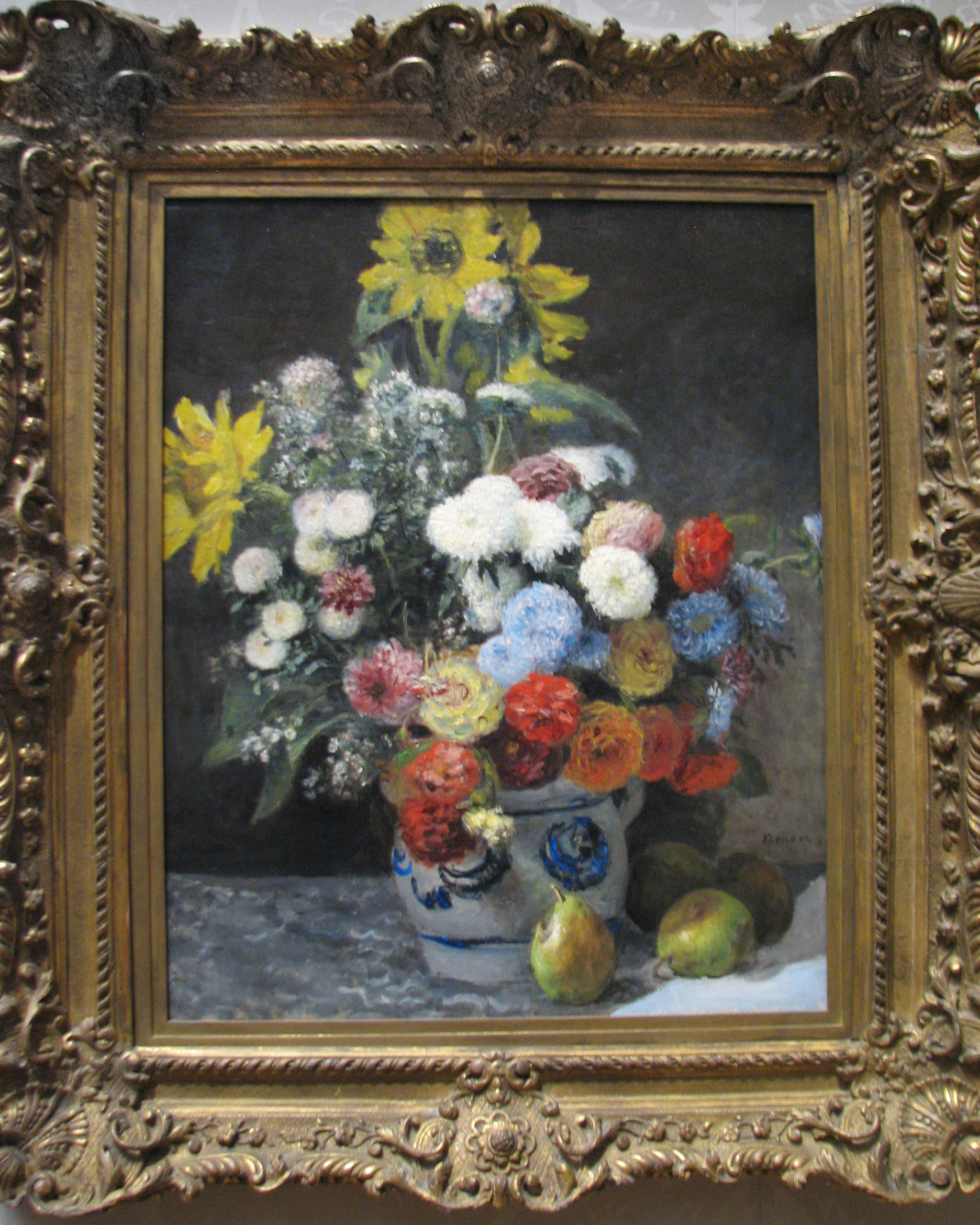 ![]() Mixed Flowers in an Earthenware Pot Pierre-Auguste Renoir, French, 1841–1919 Oil on paperboard mounted on canvas, about 1869 Bequest of John T. Spaulding 1948, MFA #48.592 "In this rustic arrangement of dahlias, asters, and sunflowers, Renoir applied paint in two different ways, conveying the delicacy of petals with short, wet strokes and the solidity of the earthware pot and burnished pears with broader, smoother brushwork. The picture marks Renoir's closest collaboration with Monet; the young artists painted the same still life, sitting side by side before the arrangement. Monet's version of the composition is now in the J. Paul Getty Museum." (From info card) |