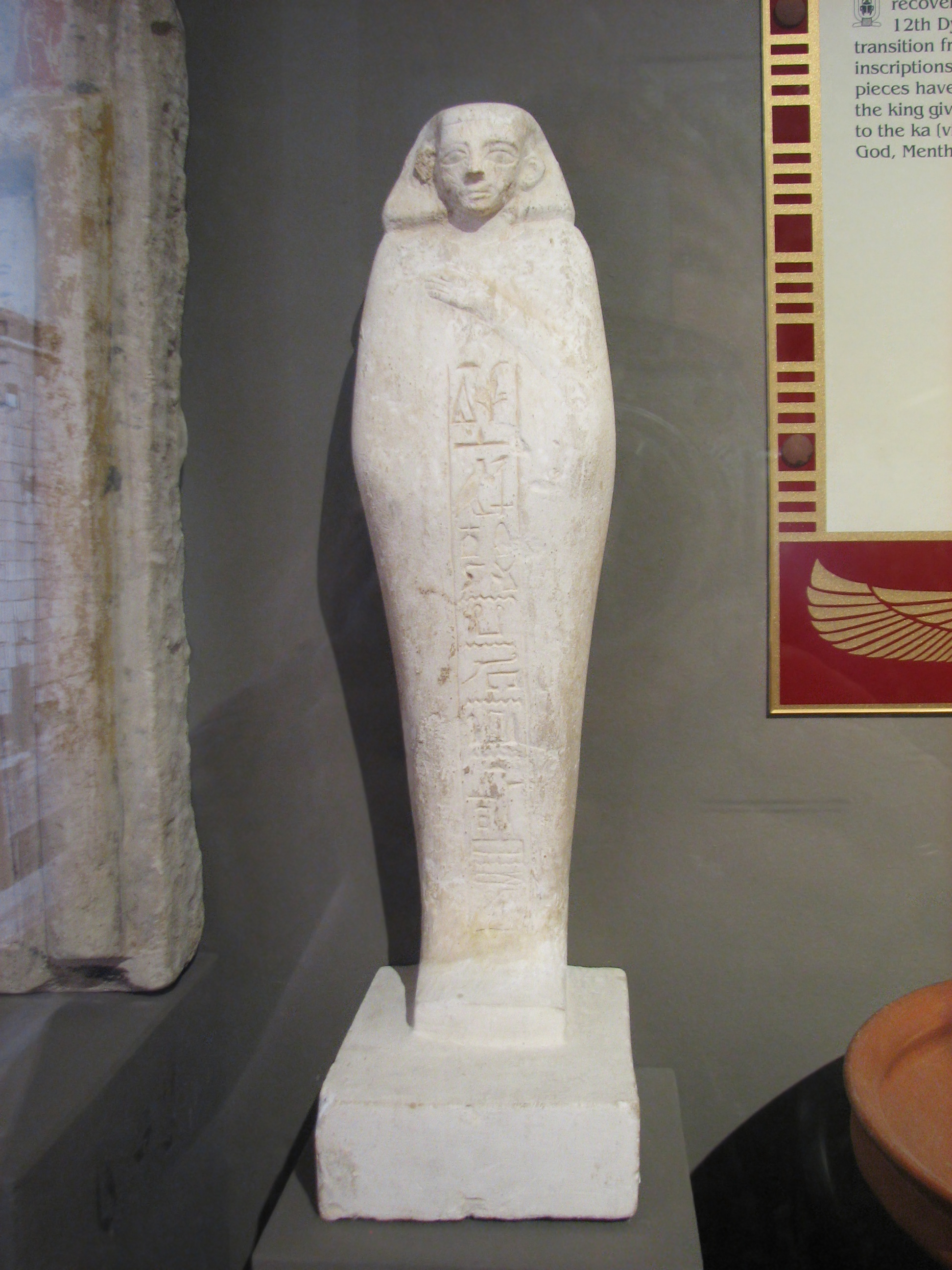Wikipedia has a photo of a early shabti shaped like a naked, standing man, in wax, from the 11th dynasty (circa 2050 BCE), Middle Kingdom, at the Munich, Staatliches Museum Ägyptischer Kunst, ÄS 6085. This wax figure has very little in common with the more familiar New Kingdom era shabtis. So we can see the Middle Kingdom San Diego statue of Mentuhotep is definitely a prototype for that more familiar shape.