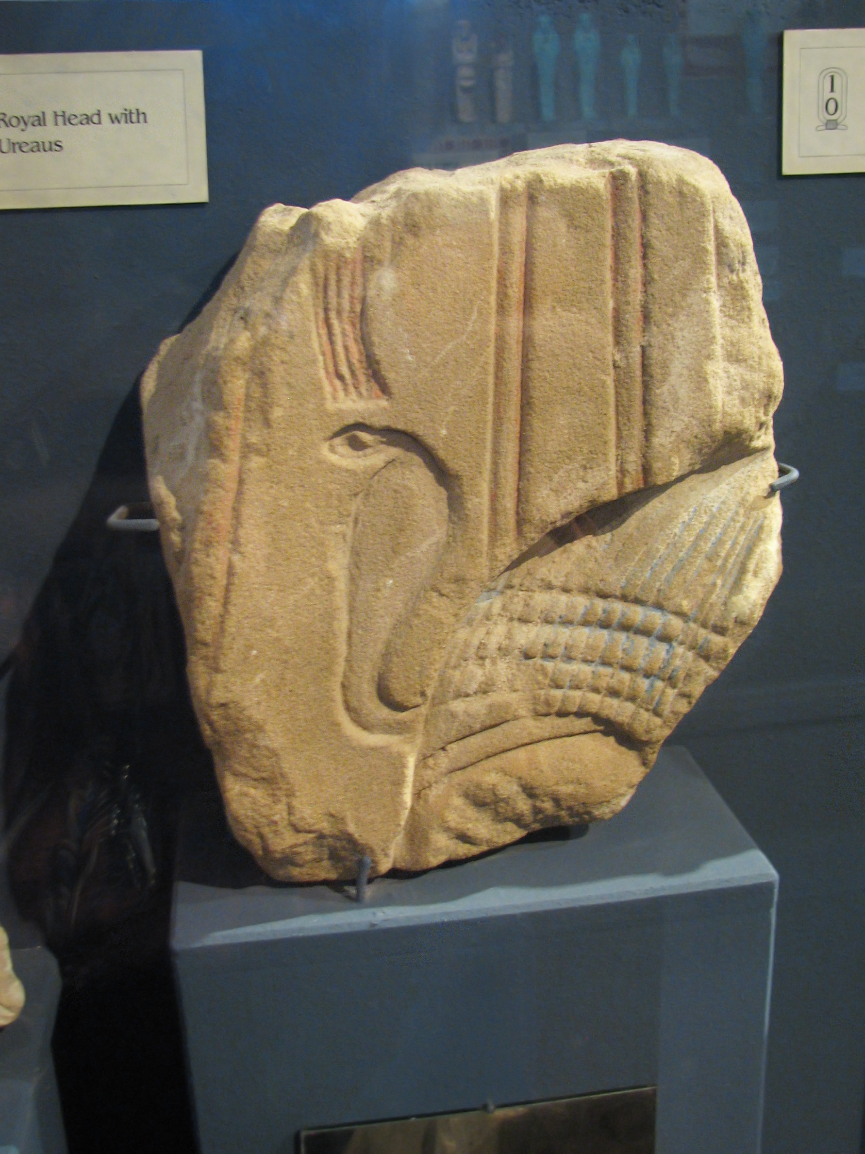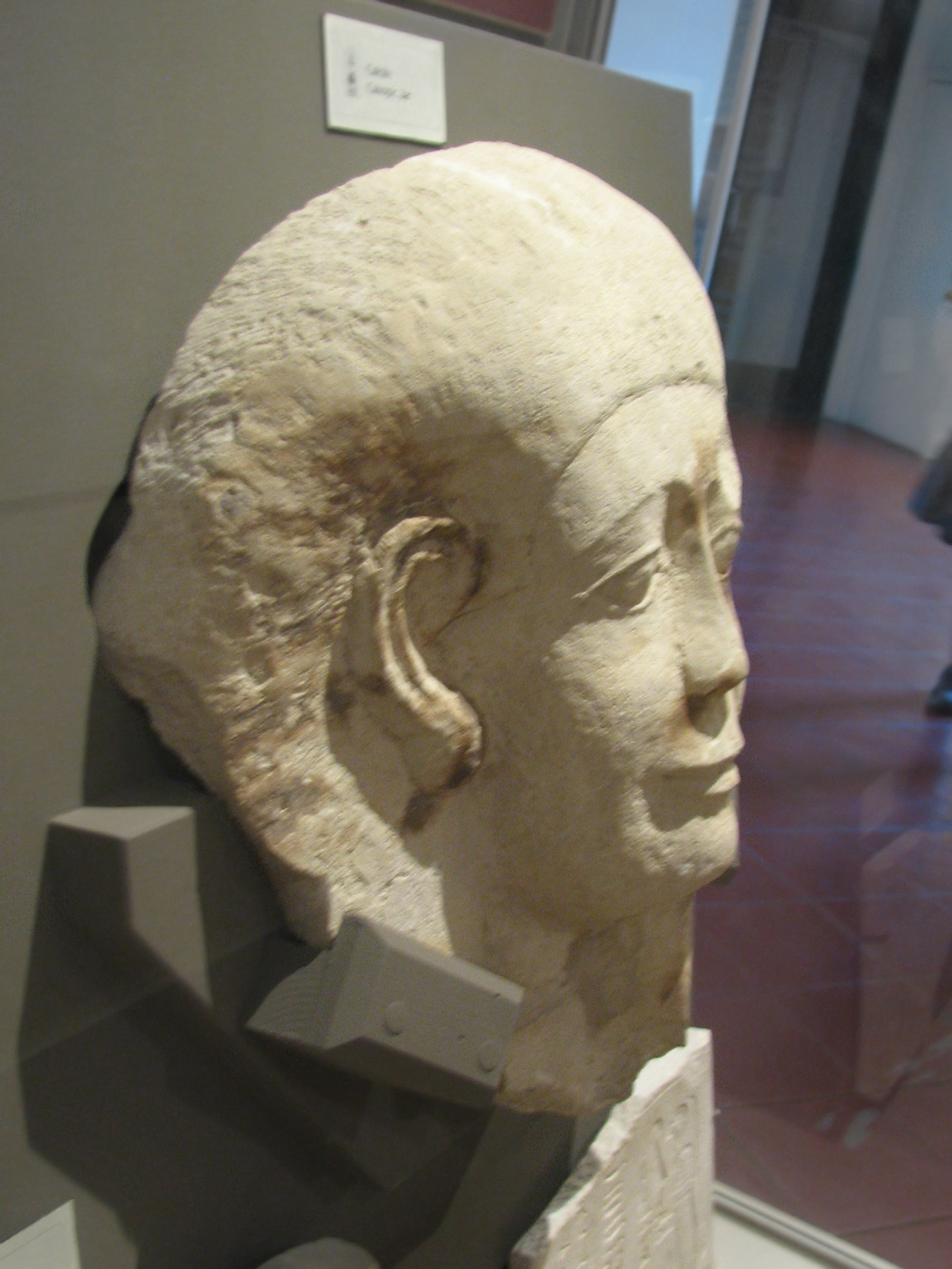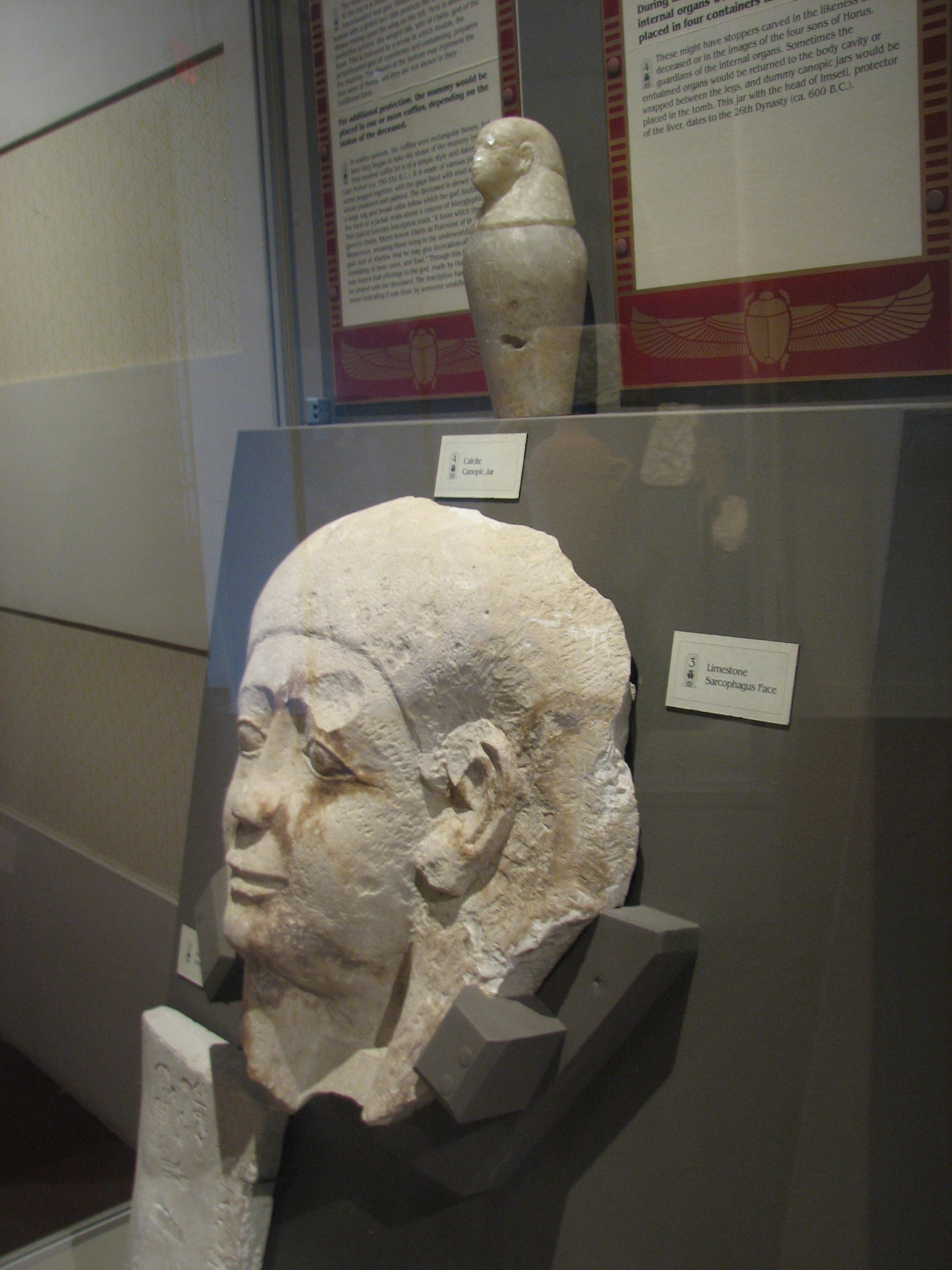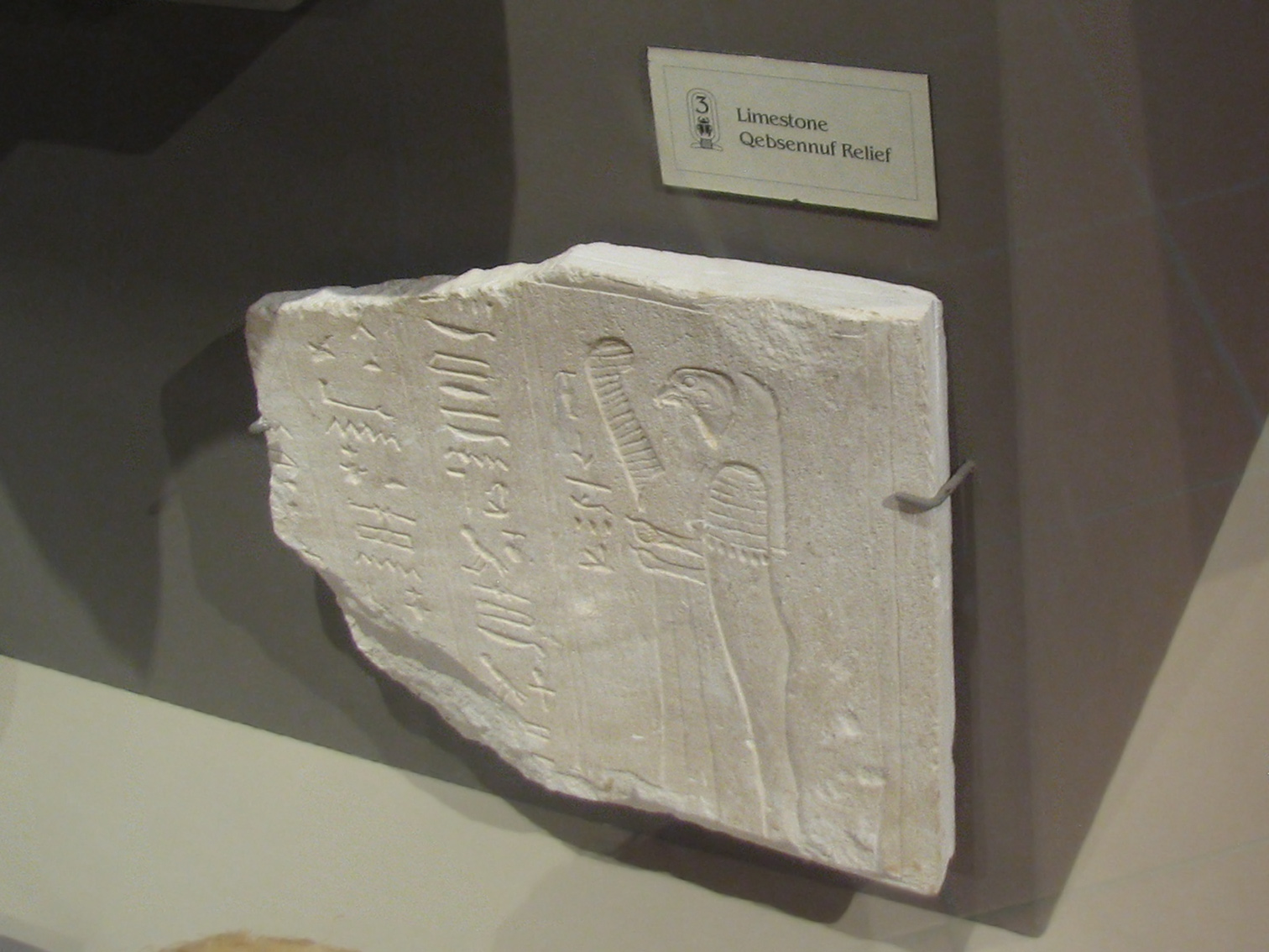 The two fragments below the face are also from the same sarcophagus. The one below features Qebehsenuef: