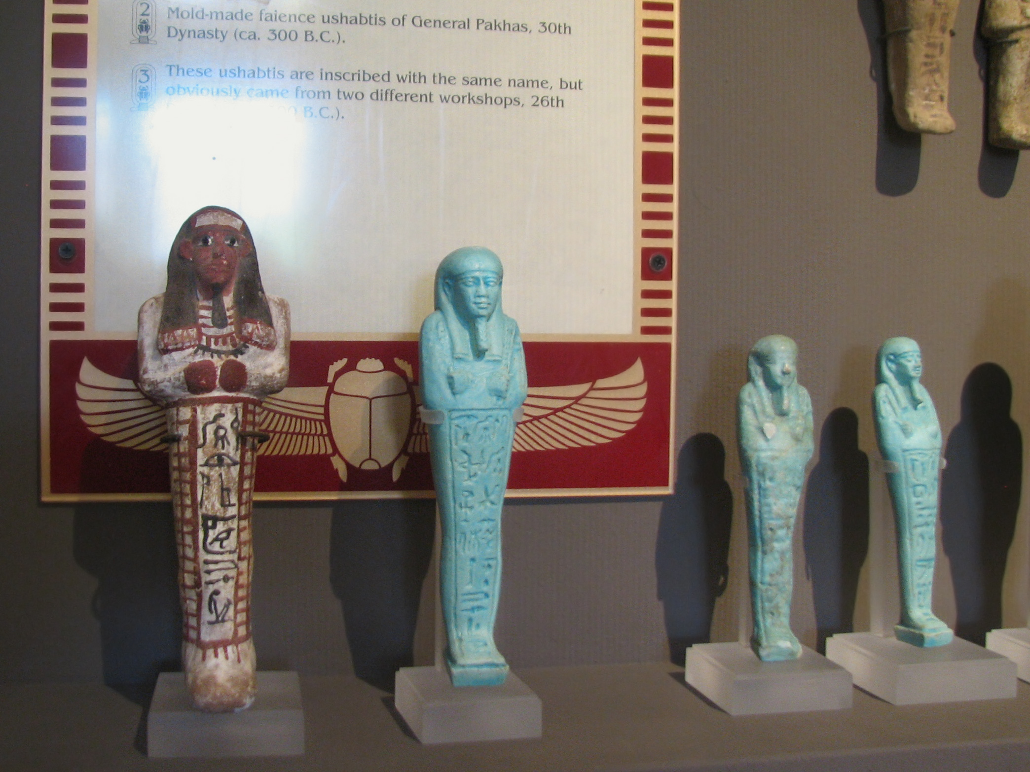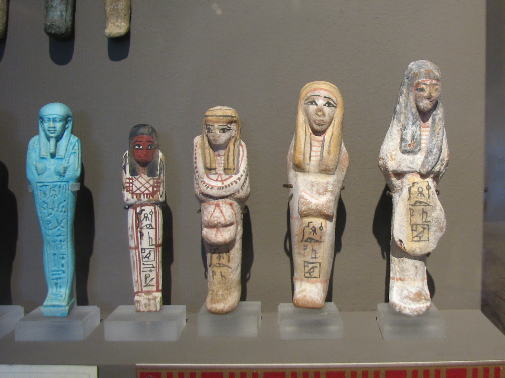 "Large sets might number as many as 365 pieces, one for every day of the year, as well as one foreman (identified by his apron) for every ten workers. Usually shown carrying hoes in each hand and baskets on their backs, these figures typically were inscribed with the name of the deceased and lines from the sixth chapter of the Egyptian Book of the Dead". (From the info card)