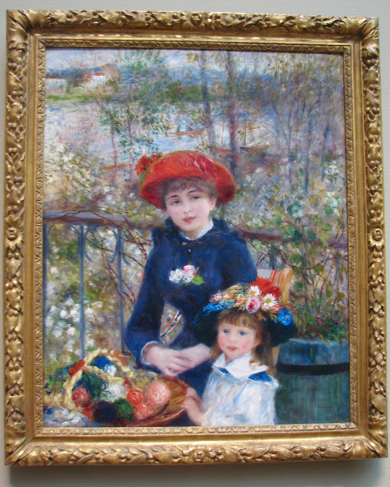 "Pierre-Auguste Renoir painted this delightful homage to springtime, youth, and beauty on the terrace of the Fournaise family's restaurant on the Seine River at Chatou—where, six years before, he had made Lunch at the Restaurant Fournaise. The painting was already under way by April 19, 1881, when, at lunch in Chatou with the American painter James McNeill Whistler, Renoir spoke of postponing a planned trip to London: "The weather is fine and I have my models; that's my only excuse." The young woman in this painting wears the blue flannel dress favored by lady boaters at the time. She and the girl at her side were not actually related. The art dealer Paul Durand-Ruel invented the title Two Sisters when he bought the painting from Renoir in July 1881."