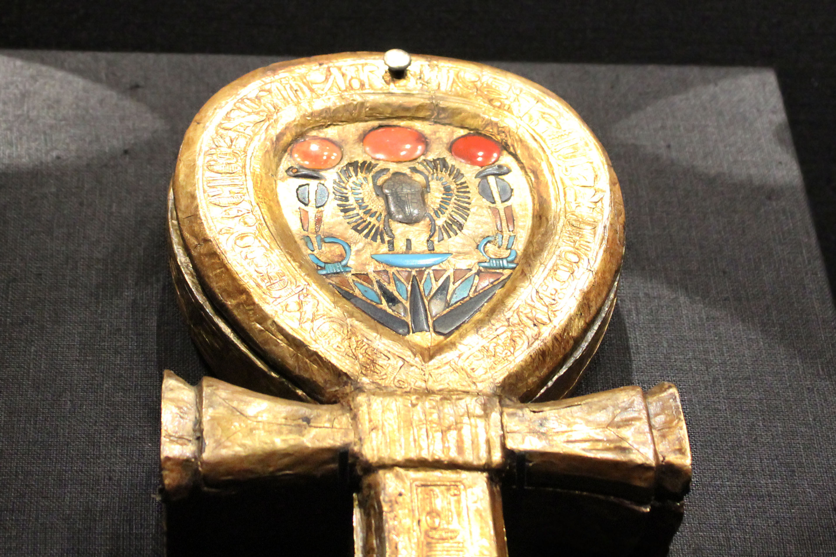 "A text on the case's hand reads, 'The good god, lord of the Two Lands, Lord of Ritual, King of Upper and Lower Egypt, Nebkheprure, son of Ra, Tutankhamun, Ruler of Southern Heliopolis (Thebes).' Additional inscriptions run around the loop; silver knobs were used to hold the lid to the case." (Zahi Hawass, Tutankhamun and the Golden Age of the Pharaohs (National Geographic 2005), page 258)