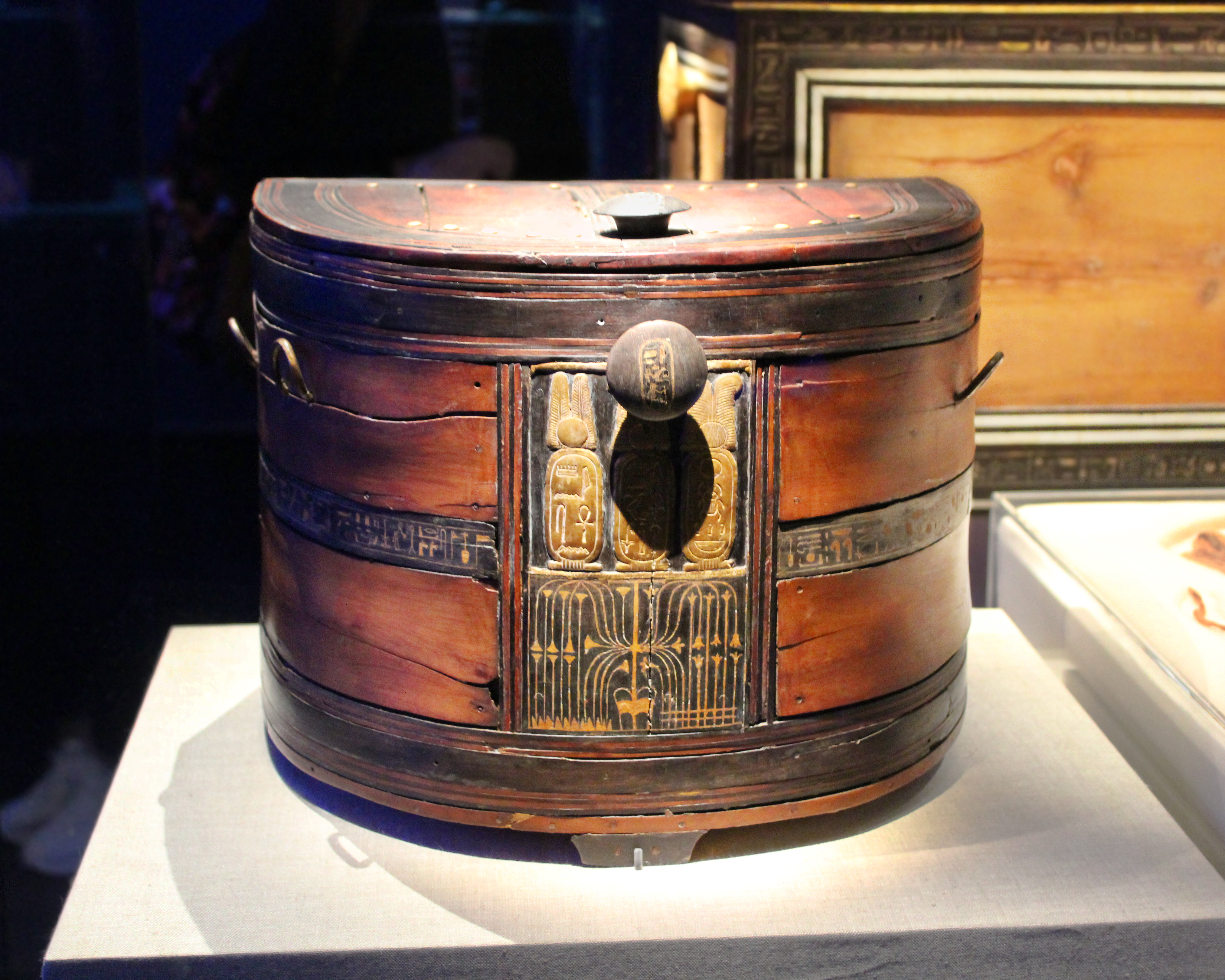 "Cartouches of Tutankhamun and Ankhesenamun appear on the front of the box. Below is the sema-tawy, the sign denoting the unification of Upper and Lower Egypt."