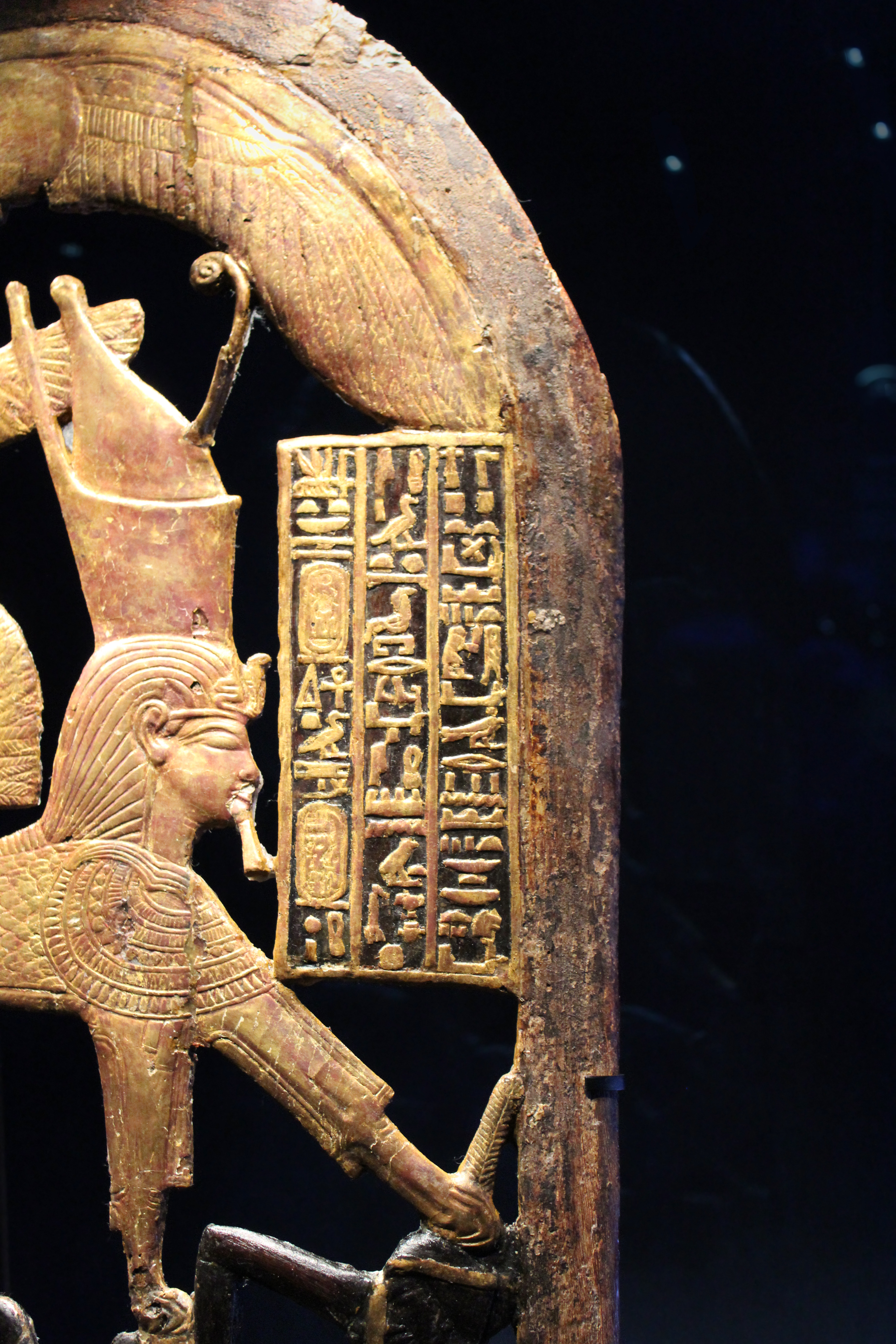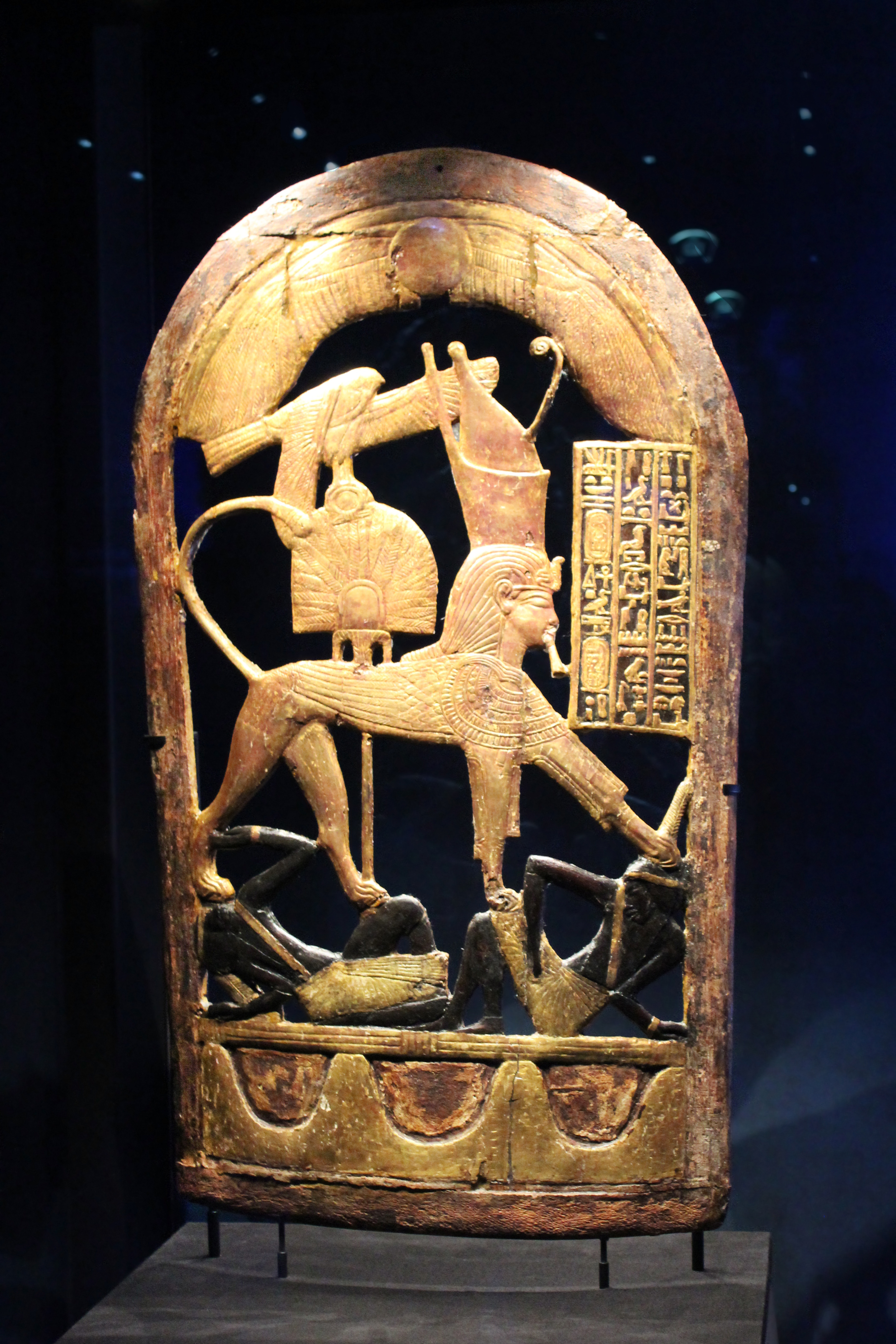 "The rolling hills at the bottom of the shield form the hieroglyph that translates as "foreign land." The king is portrayed trampling his enemies underfoot." (From info card)