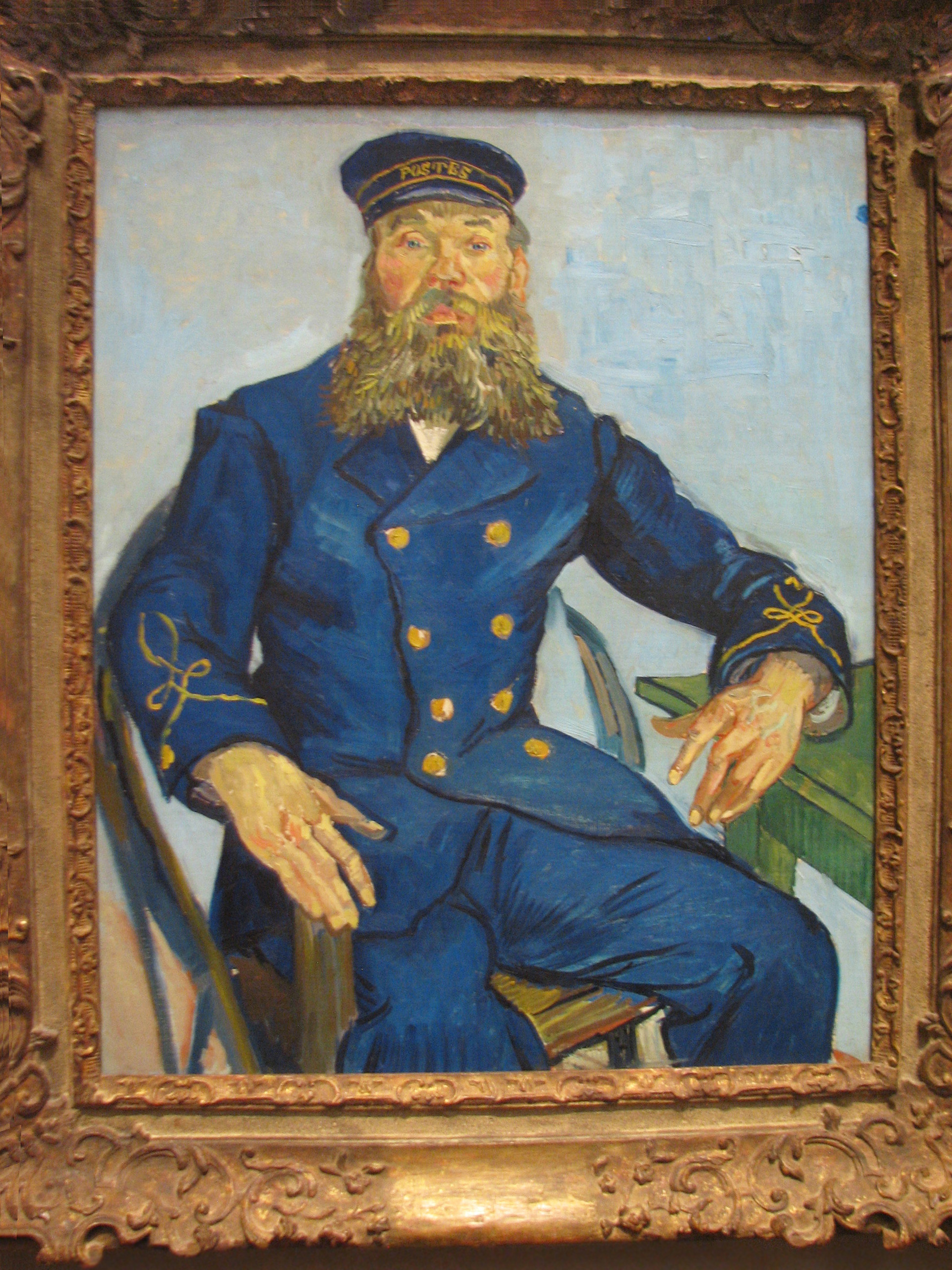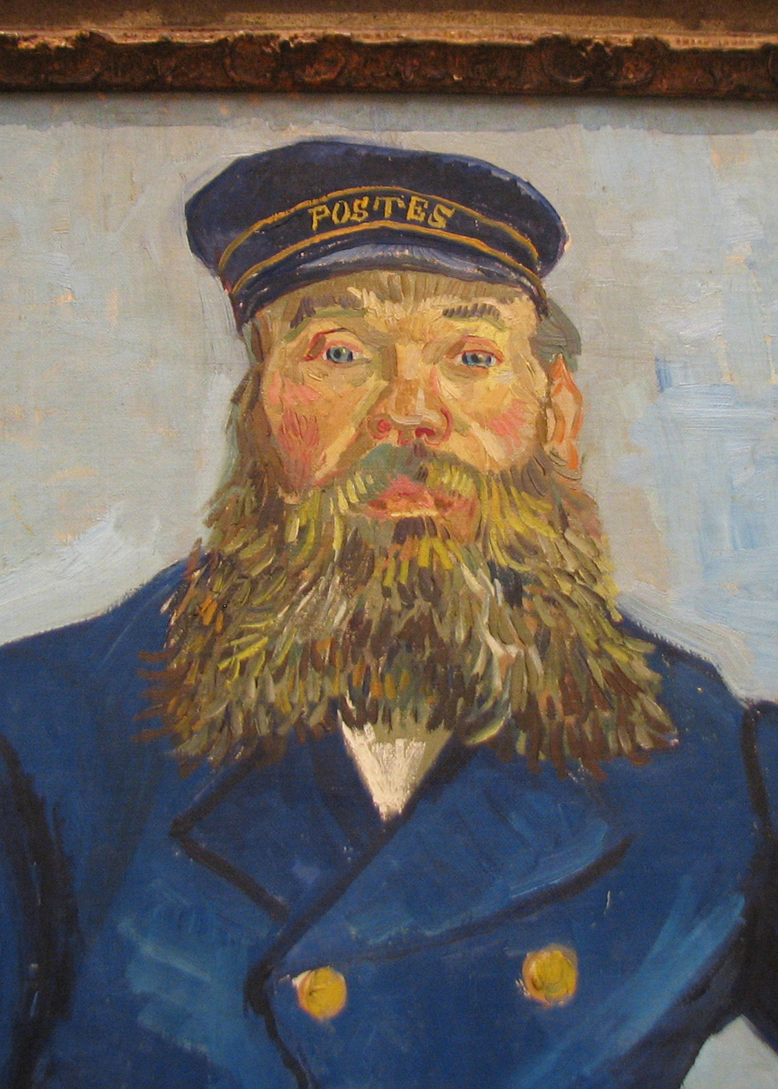 "Van Gogh left Paris for Arles, a small town in southern France, in February 1888. One of the closest friends and favorite sitters he found there was the local postman, Joseph Roulin, with whose fiery left-wing politics the painter sympathized. While painting this portrait, Van Gogh wrote to his broth, 'I am now at work with another model, a postman in a blue uniform trimmed with gold, a big bearded face, very like Socrates...A more interesting man than many people."