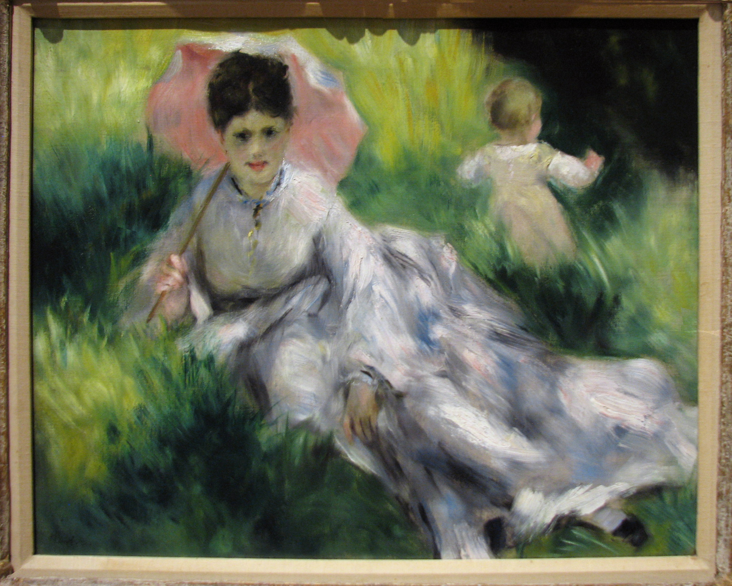 ![]() Woman with a Parasol and Small Child on a Sunlit Hillside Pierre-Auguste Renoir, French, 1841–1919 Oil on canvas, 1874–76 Size: 47.0 x 56.2 cm (18 1/2 x 22 1/8 in.) Bequest of John T. Spaulding 1948, MFA #48.593 "Renoir's model for this painting was likely Camille Monet, wife of his fellow Impressionist Claude Monet; Renoir painted her on several occasions between 1874 and 1876. Here she sits on a hillside, her white dress dappled with pink and blue in the shade. Her grace and composure stand in marked contrast to the toddling child who wanders off into the background at right, oblivious of the painter's presence." (From info card) |