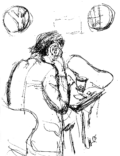 While sitting in the the Guggenheim cafeteria, with its dark reddish shaded walls and round windows, I am inspired to try a sketch of what I see.