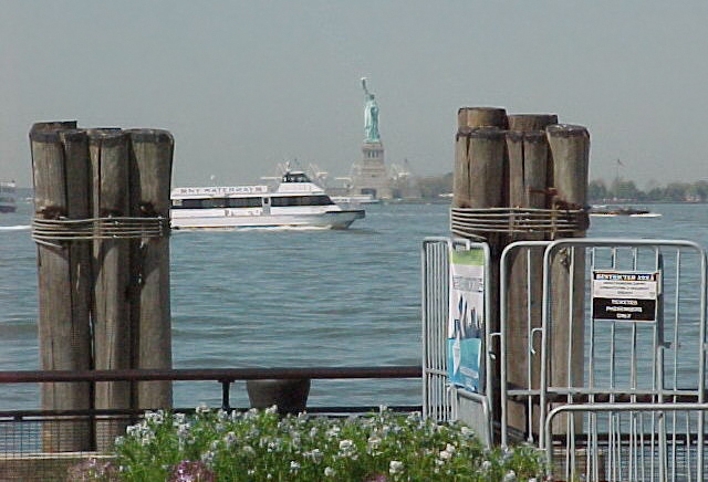 I found the subway (86th and Broadway) and made it to South Ferry. The Lady is in sight across the way. The next ferry doesn't leave until 11:15am, so I've found a shady spot from which to enjoy her in the distance. I can't believe how much I sweat here. It's not 'hot' as any desert dweller would define it, but the sweat pours off just the same. However, I am grateful for my place in the shade.