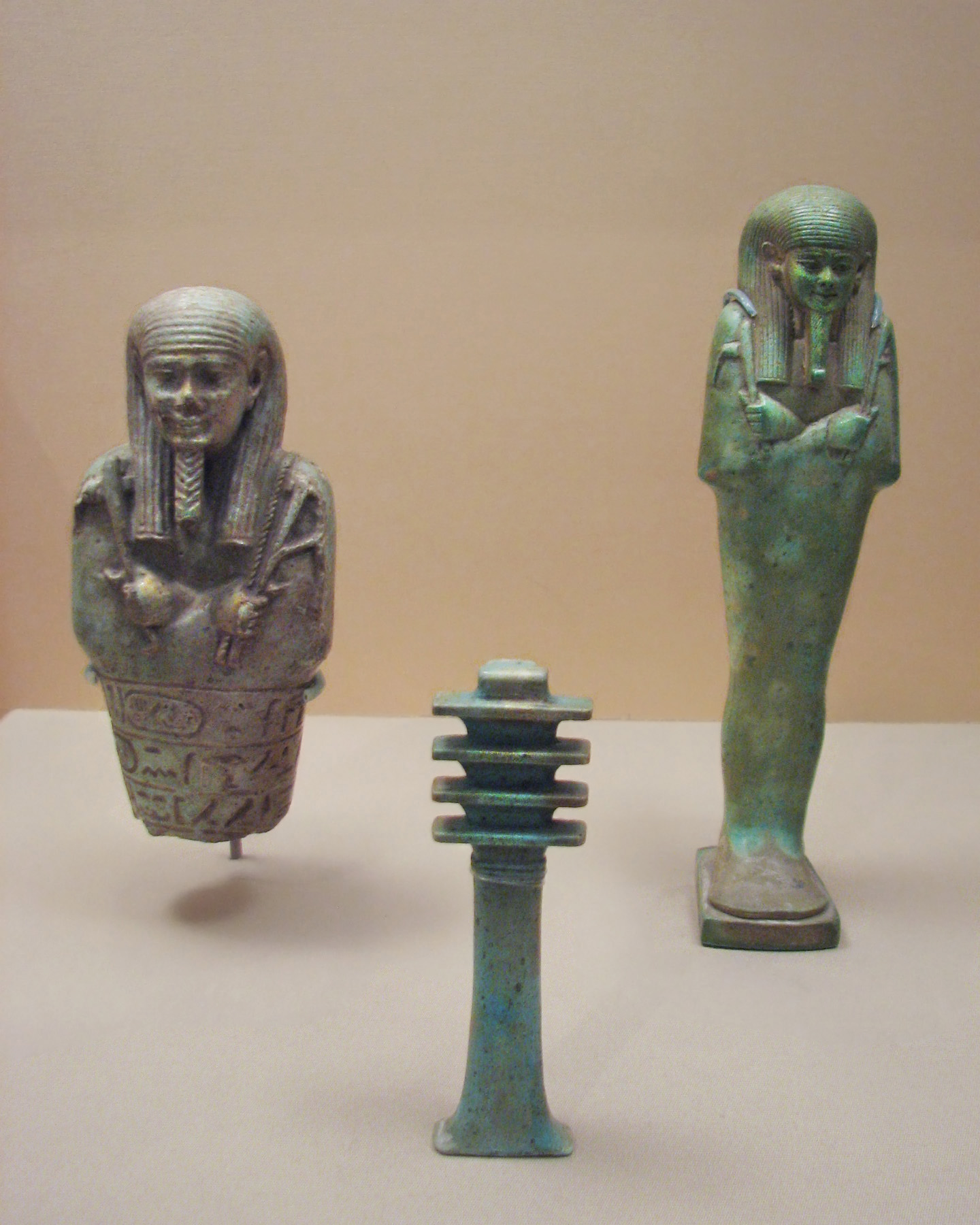The item in the center is a djed pillar from the Late Period or Ptolemaic Period...