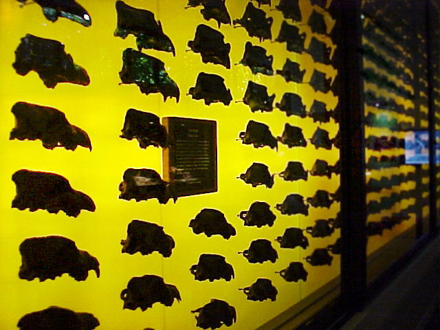 These 404 Dire Wolf skulls represent only a portion of the more than 1600 wolves whose remains have been found in the La Brea tar pits. It is thought that packs of Dire Wolves attempted to feed on animals trapped in the asphalt and became mired themselves.