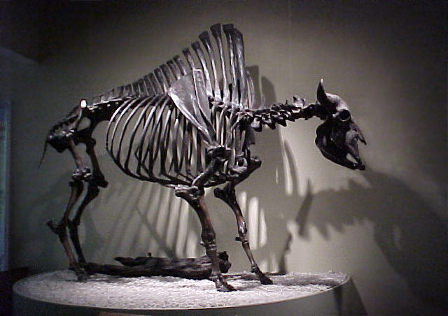 The Antique Bison is the most common plant eater found at Rancho La Brea. At least 159 of these animals have been retrieved. This extinct bison had a larger body, greater shoulder hump and longer horns than the modern buffalo.