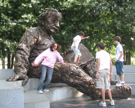 While it was unexpected that we could not receive entry Thursday into the tall monument, we also had an unexpected delight that day. Due to construction, the bus let us out in a different spot than in those carefully saved maps I'd printed. But it allowed us to discover the Albert Einstein memorial. A huge bronze of the old sage posed sitting on the ground delighted us. Seated so, he was more approachable than we would be sternly posed in a 'throne' or standing tall and proud. Down to earth, his statue proved a friendly place to children: