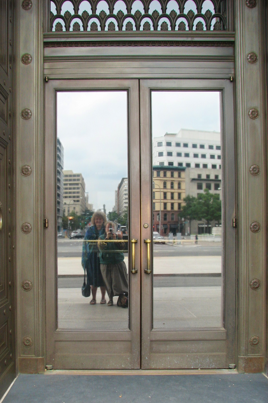 Julia and I seeing ourselves in the doors to the National Gallery of Art. Behind us, the streets...