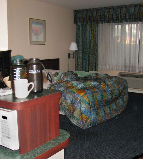 We have arrived in Tucson! I picked Julia up from work and off we went east on I-8. At the first rest area, Julia took over driving. I was to change with her on the next stop. There was a rest area only twenty one miles further, but we didn't need that one. However for nearly 200 miles, I never saw another rest area. So Julia drove the entire rest of the way in. Fortunately we found a nice classical station WBAG which played pleasant selections. But the constant 'A" line of the highway lines had an hypnotic effect and I drifted off to sleep. I had a dream in which I was in a airplane, forever taxi-ing. I was thinking, "Shouldn't this plane be air borne by now?" There's always a thrilling feeling when it finally gets aloft, which hasn't dulled with repetition. I woke up in time to help Julia navigate in the city. Most of the highway exits were closed, except for Prince-254, a familiar exist. Laura and I always used it to enter Tucson. However, all the new buildings, including a MALL(!), certainly weren't familiar. A lot of changes have happend to this town between our last visit in November 2001 and now. I really shouldn't be surprised, for Yuma has undergone a proportionate number of changes, relative to its size. (For instance, our huge new mall would surprise one who hadn't visited in a while.) So as we headed down Prince, I noted what was familiar, nestled within all the new. Fortunately I remembered in time that to access Grant, I'd best turn on Oracle, for Grant is parallel to Prince! The hotel seems decent, it has a breakfast restaurant, our adventure is well underway!