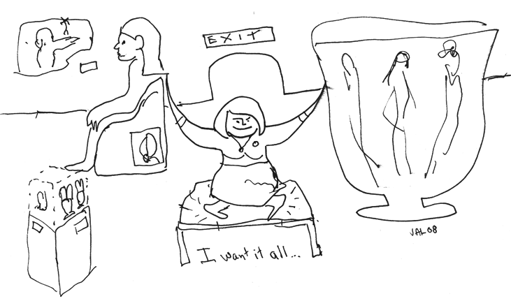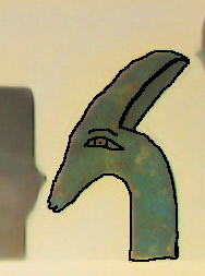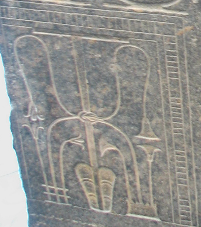 You can imagine in that sketch I have Senwosret III's statue, )okay, that was at Brooklyn museum)(note sem-tawy on throne), the wine mixing vase, Seti II's cartouches, a wall relief of Setne Khaemwaset )this, too, at Brooklyn museum). And note the small round badge, showing paid entrance fee. (The sem-tawy under linkage is from a pharoah's statue which sits in the Dender temple room.