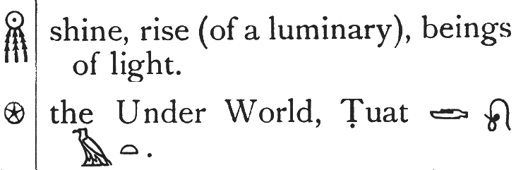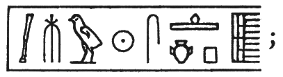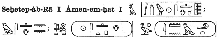(From info card) "The block whose two decorated surfaces are displayed here originally spanned a wall separating two rooms of a temple dedicated to Amenemhat I. The block has been cut apart so the faces can be shown side by side. "In the scene at the right, Amenemhat I, identified by his cartouche, faced his son, Senwosret I. Amenemhat's crown with its two tall feathers is visible below the protective wing of a hawk or vulture, the presence of Senwosret I is indicated only by his cartouche and the expression 'the king himself.' In the scene at the left, Amenemhat I, identified by his Horus name and the beginning of his cartouche, was on the right. Senwosret I, represented here by his Horus name and the term 'the king himself,' again faced his father. Nekhbet, the vulture goddess of Upper Egypt, and Wadjet,the uraeus serpent goddess of Lower Egypt, perched on their respective plants, extend shen signs, signifying universal domination, to hawks surmounting the kings' names." This must be the piece on the left. Budge's dictionary gives the cartouche for Amenemhat I: |