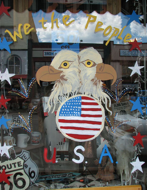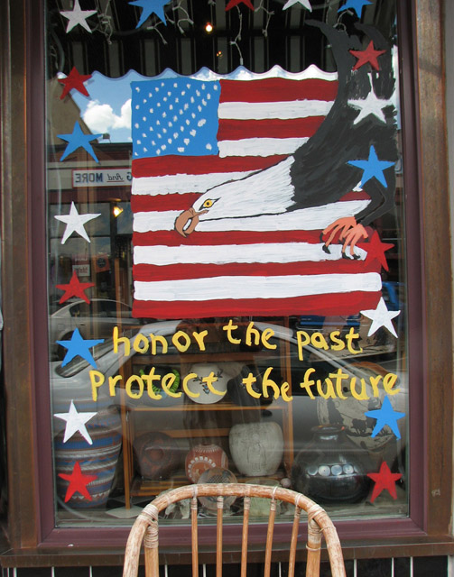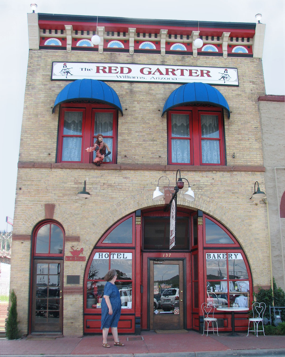 In addition to rather patriotic ones, some windows featured signs concerning the murder of a local, hoping for justice. We finished our tour of the town at Grand Canyon Brewery. Julia had two large mugs, one a wheat beer and one a light summer beer. No Italian sodas available, I took a Sprite. I had trouble getting up on the tall stool made from a tree trunk. Without a rung on which to place my feet, they dangled. Short legged drunks could have a fall end their drinking session. Our hotel wasn't fall from there. It features a spacious lobby, including a two foot long train model as part of the decor, in addition to several Frederic Remington's lively bronze sculptures of horse and riders. The hotel's restaurant also features a train model, this up high on a railing which also serve as a train track. It makes a circular path around the outer circumference of the restaurant and gift shop. We ate potatoes au gratin, macaroni and cheese, asparagus, breaded catfish and noodles in pesto sauce. I also had a couple of bites of Julia's carrot cake. Everything was tasty. Now we're settling in for a restful night. Garrison Keillor's Prairie Home Companion accompanies us, whether it is a desert home or a mountain hotel.