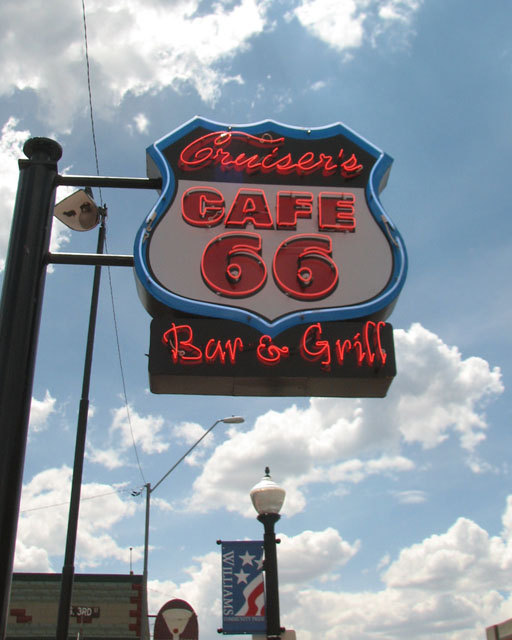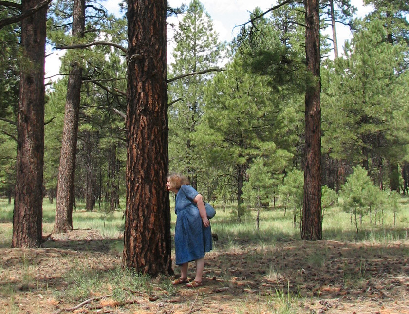 While I woke early at 2:00am, we did not get on the road until 4:12am. I don't know how Google maps figure it will take just over five hours to get to Williams, it took us a little less than eight hours! We did not make an extraordinary number of pee break stops, but we did take a long break on the last one, at the Kaibob Forest rest area off of Purple Heart Trail (I-40). Julia noticed a walking trail there. It featured informative signs, whereby we learned the Kaibob is the largest ponderosa pine forest in the world. Ponderosa pines are low water consumers, as are cacti. However cacti would not survive the high elevation cold. The rocks here have a peculiar pitted surface because they are porous volcanic rock, some with occasional rounded splotchy green molds.