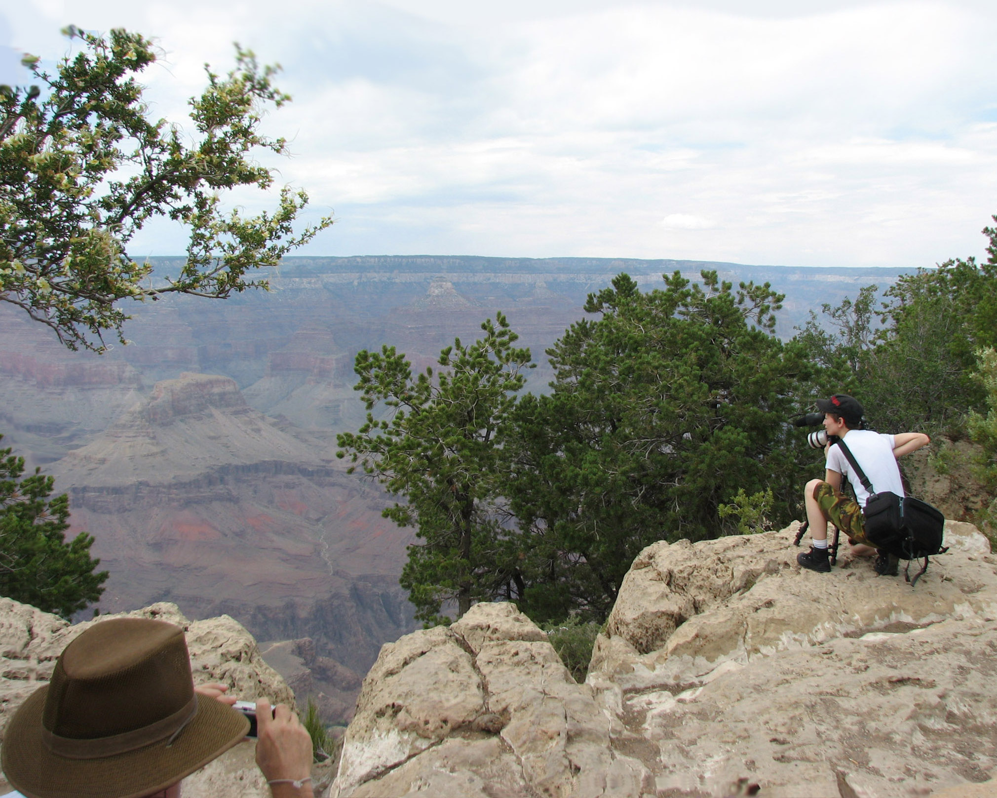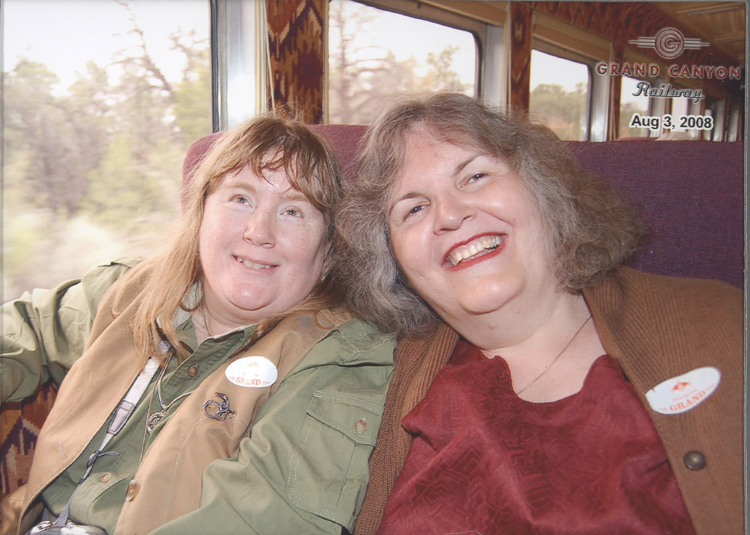 What can I say? The Canyon is awesome, and there's no photo or movie that can really convey the experience. (But I will try with mine.) At its widest point, it is 18 miles across, on average it is 10 miles wide. It's 277 miles long, and nearly one mile deep. The train is a fun way to get there. Everyone did their part to be as entertaining as possible. Musicians came into each train coach and played and sang for us. One had a guitar and a mouth harp attached to a device that held it in front of his mouth so he could play both in songs featuring trains. Another had a banjo and sang. Another at the trains return got our friendly hostess Lorraine dancing as he played and sang an old Beatles tune, "Feelin' Groovy". A travelling photographer took our picture with her huge lensed Nikon camera: |