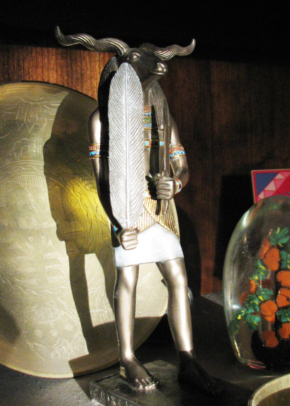 The rain was cool and refreshing and I was glad to slowly get back to the car. By the time we made it back to the hotel room, it was a torrential down pour. We stayed in the car, while I packaged up the camera to keep its case drier. Then we made a mad dash inside. We hung up our clothes to dry and watched TV, a feature on the history of bread making and then one about excavations in Meso-America. By the time that was over, we were hungry and our clothes were dry. Looking at the phone book, Dara Thai, a Thai restaurant, looked most promising. I had sweet and sour tofu and a few bites of Julia's ginger fish. We also had veggie rolls, Thai tea (the real thing, not those powdered over cinnamoned mixes), and green tea ice cream. That was a very tasty way to end the meal. On the way back, we saw a new-agey shop and a place to park nearby. Julia is now studying a book on Vedic astrology. She also got some rose oil and I found a nice statue of Khnum (or more precisely, another deity, a guardian in the after life?). He is holding a huge Ma'at feather, and a small sword. There were lots of statues, including an amusing one of Ganesh stretched out on a lounge chair reading. If it hadn't have cost 120 bucks, I might have tried to find a place for him. But I think he will find a good home somewhere else. We've had a wonderful time. Tomorrow, we'll head back south to hotter, drier and less greener climes, but with such nice memories of this charming area and some of its attractions.