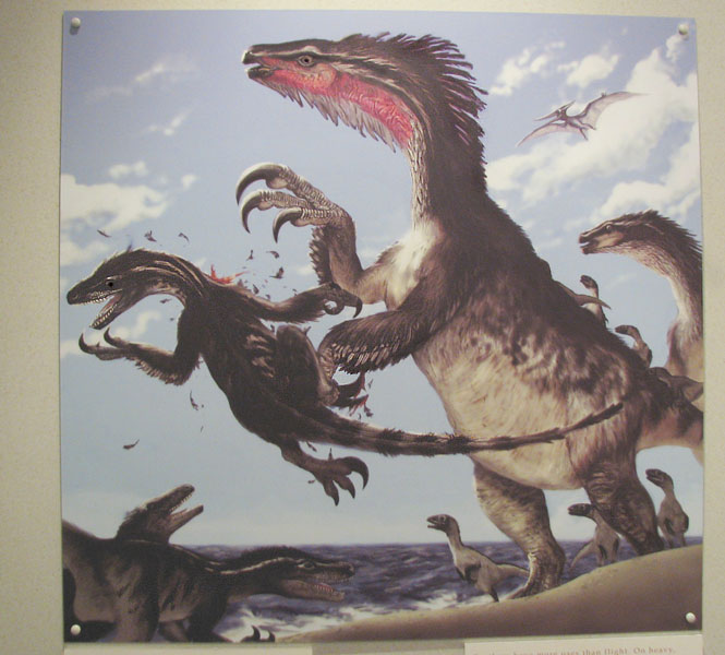 Photographs could not do justice to the other exhibit of works by Adrian Hatfield. Many of his paintings were done with a unique multi-layering technique using resin. The result is a three-dimensional effect. My favorite is a large piece framed with a velvet curtain. It looks like a fantastic aquarium, bursting with active life. Another intriguing piece features a dinosaur 'falling' through a Victorian type wall paper. The discovery of the great age of the dinosaurs upset the Victorian sense of order. What is amazingly synchronistic is how his art brought together everything we've seen on this wonder-filled trip. I'll let Tom Patin, Director of the School of Art at NAU, describe it: