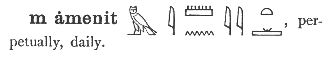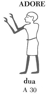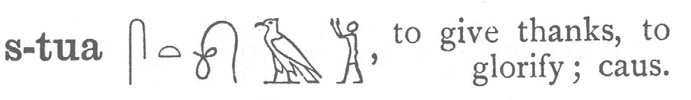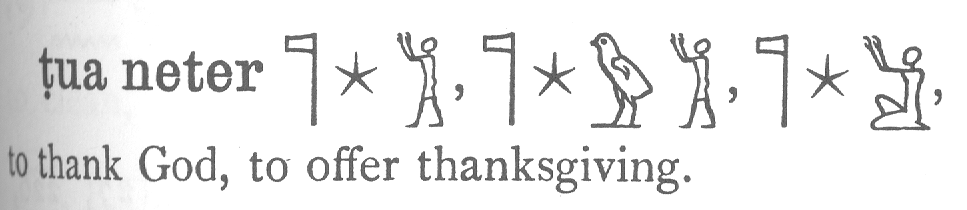 I had a bit more trouble with finding words for the last phrase, 'so grateful'. Looking in Budge's two volume dictionary in the English words index, I don't find 'grateful', 'gratitude', nor even 'appreciation'. There is, however, "to offer thanksgiving"(with a emphasis towards thanking the gods) and "to give thanks". Remembering one element of those phrases as being pronounced dua, not tua, as I've seen in Wilkinson's book adds to the complexity. Hmmm. Perhaps 's-dua' is is the closest to what I mean. |