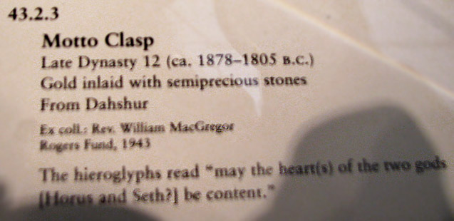 ![]() I'm sure the gold and jewel inlaid 'motto clasp' declaring "may the hearts of the two gods (Horus and Seth) be content." is lovely... Note of 12-16-15, found it online! The two "Netjer" flags serve as frame for the "Ib" heart glyph and the "Hotep" glyph.