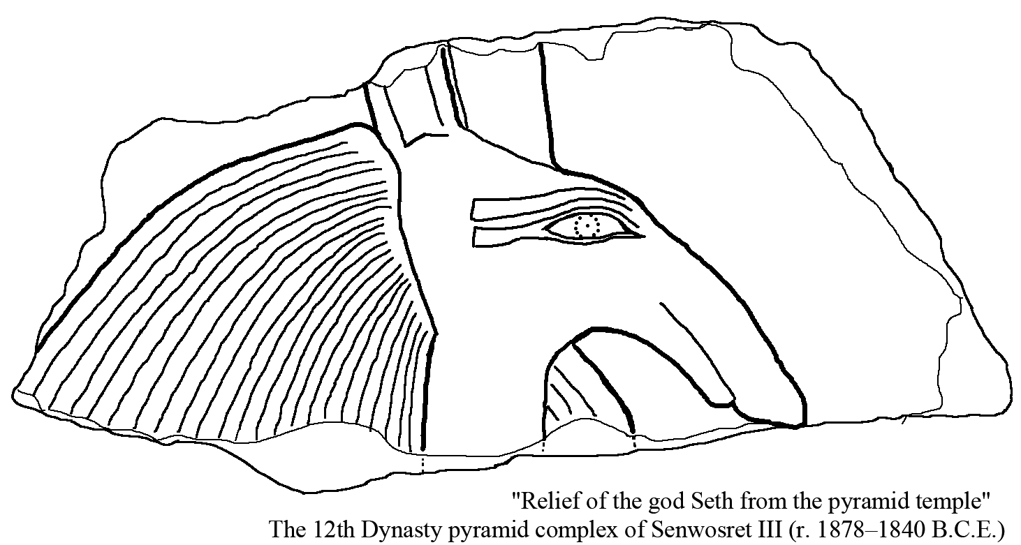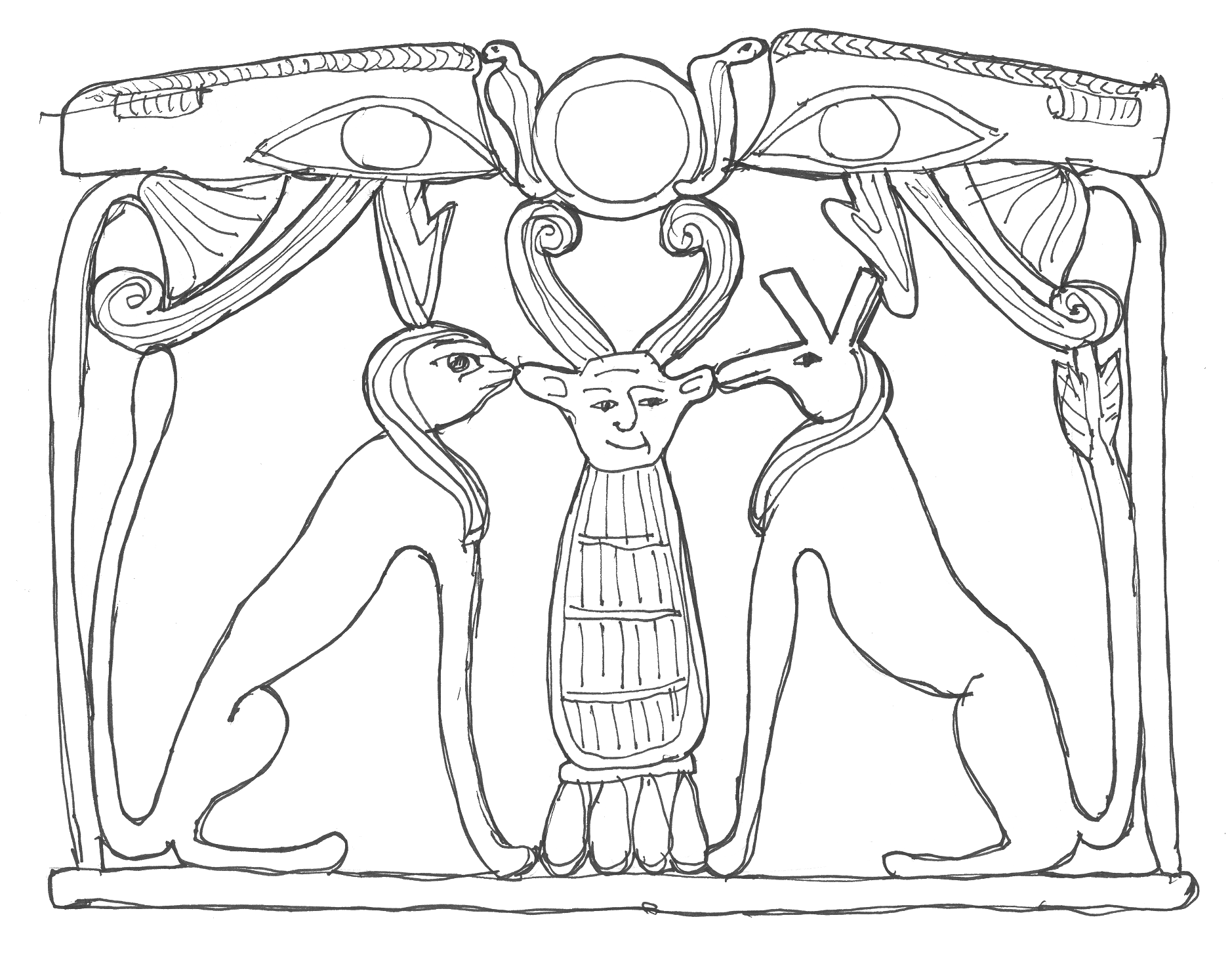 the lovely pectoral ornament featuring Set and Horus are in it. The side I've only seen is actually the back side (which I've drawn above). The two devices to the outside of the two large eyes are channels for the neck cord to go through. The front side "inlays of lapis, carnelian, and feldspar (?) are mostly lost, having fallen out.." So that side, with its missing inlays, is not usually shown to us. The craftsmanship is amazing, consider all this detail is packed into a piece only 1 1/2in (3.8cm) high!