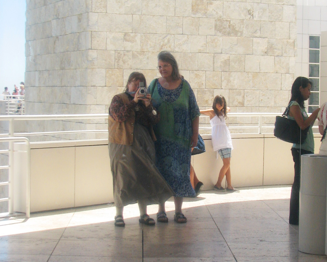 (Conversely, the air down in the valley, although breezy, was meriting the reputation Los Angeles has.) But on the mountain, and on the coastline, where the Getty Villa is, it was easy to breathe. One photo of Julia and I caught in a reflective window at the Getty Center gives evidence to the breeziness: |