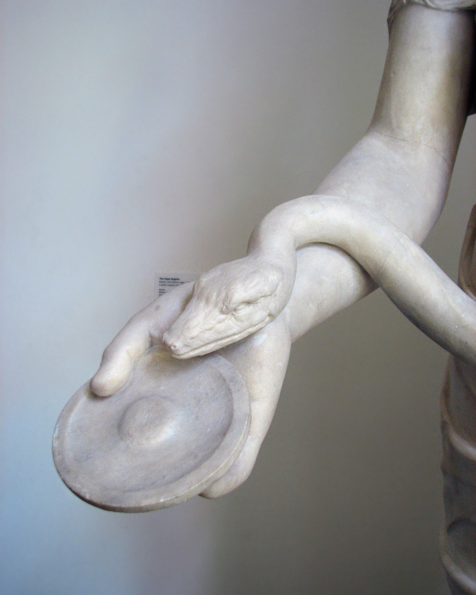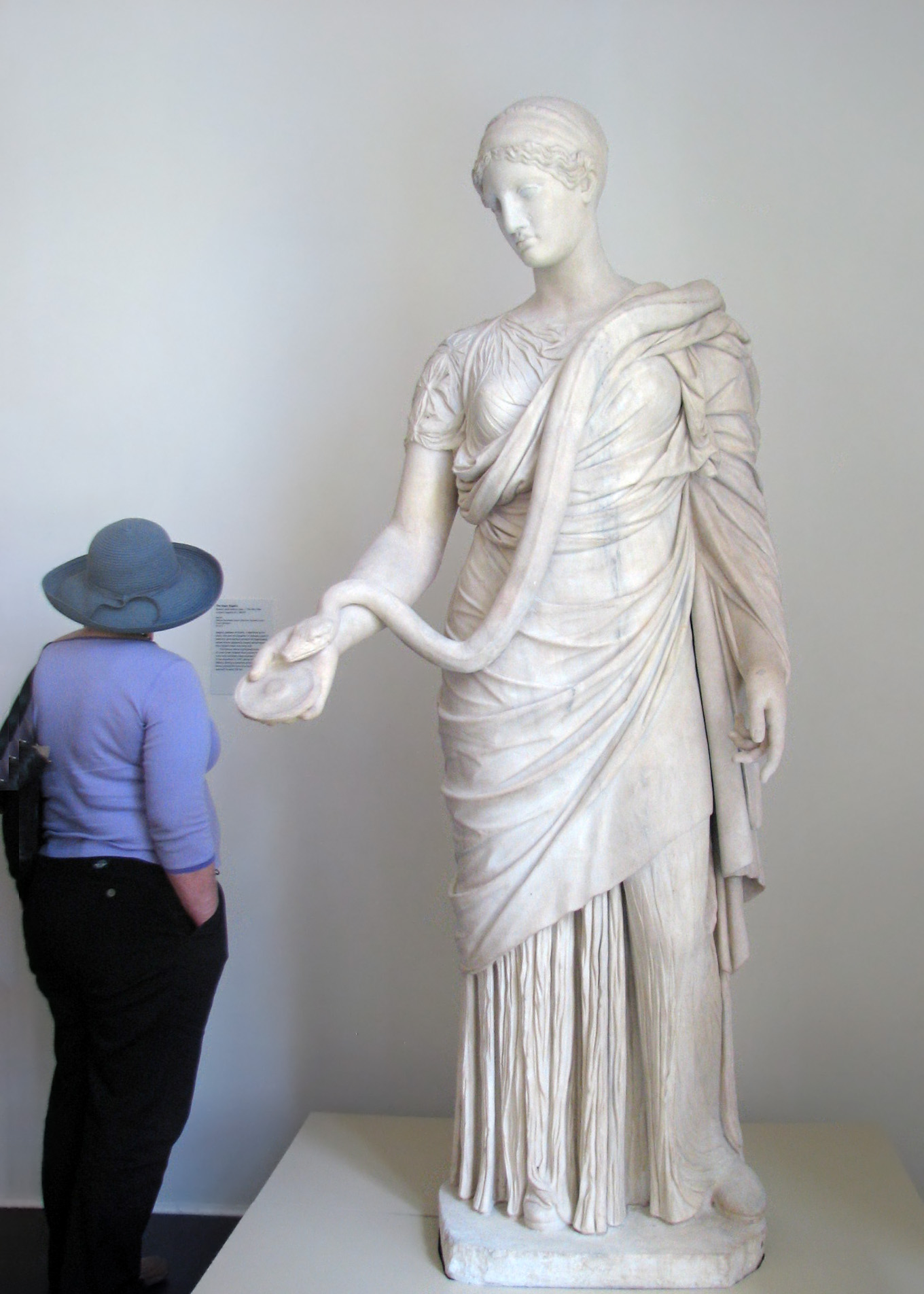 "Hygieia, goddess of health, is identified by her snake. She was the daughter of Asclepius, god of medicine (and mythical ancestor of Hippocrates), whose shrines apparently housed sacred serpents. Here Hygieia feeds one some milk. "This famous statue is presumed to be a copy of a lost Greek original from around 360 BCE and is the only complete, larger example of the type. It was unearthed in 1797, along with the Hope Athena, during excavations at Ostia, the port of Rome, among the ruins of an ancient palace that was built around 138-161." ![]()