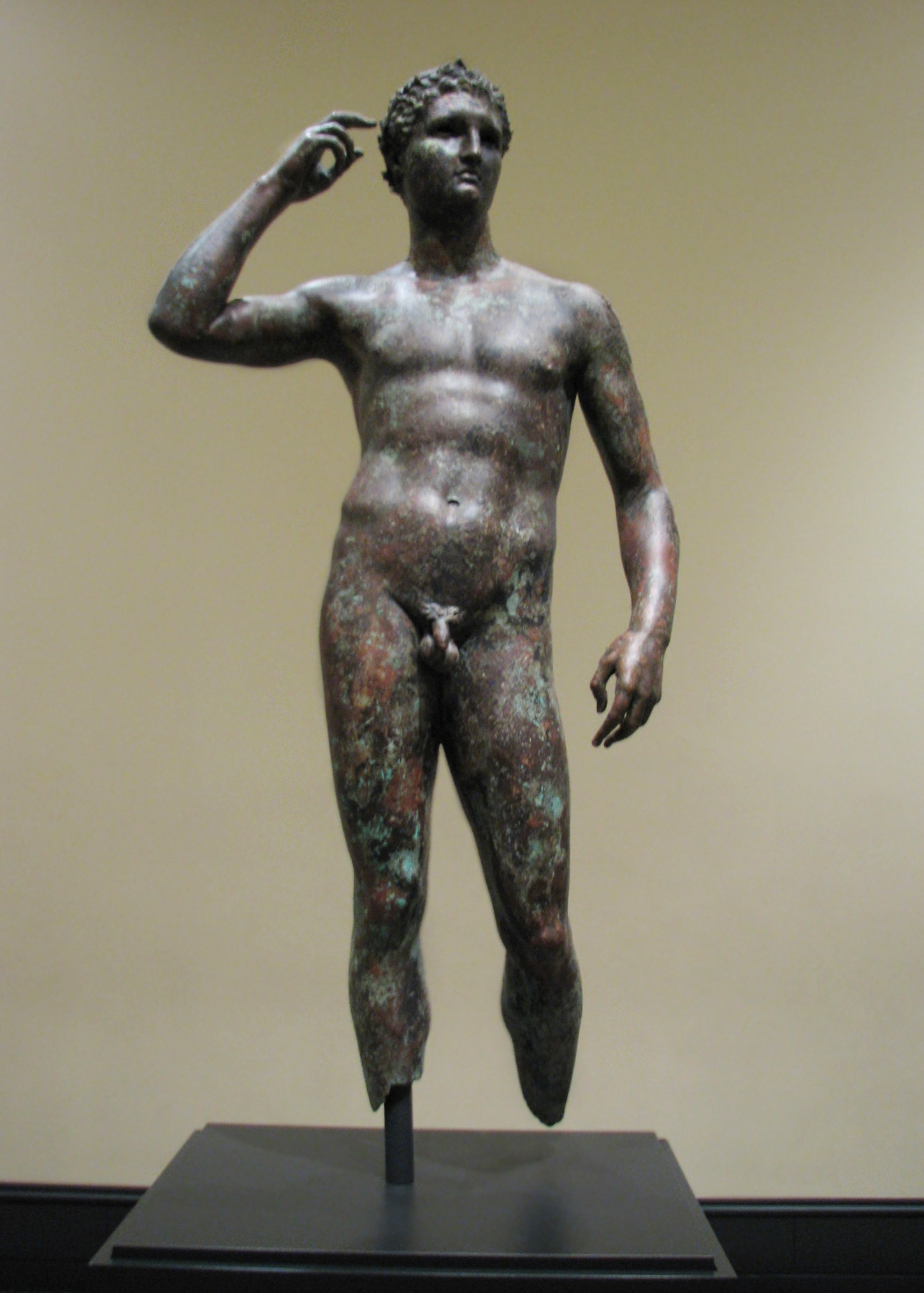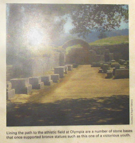 ![]() "Lining the path to the athletic field at Olympia are a number of stone bases that once supported bronze statues such as this one of a victorious youth." Image and text from the Getty Museum's info plate